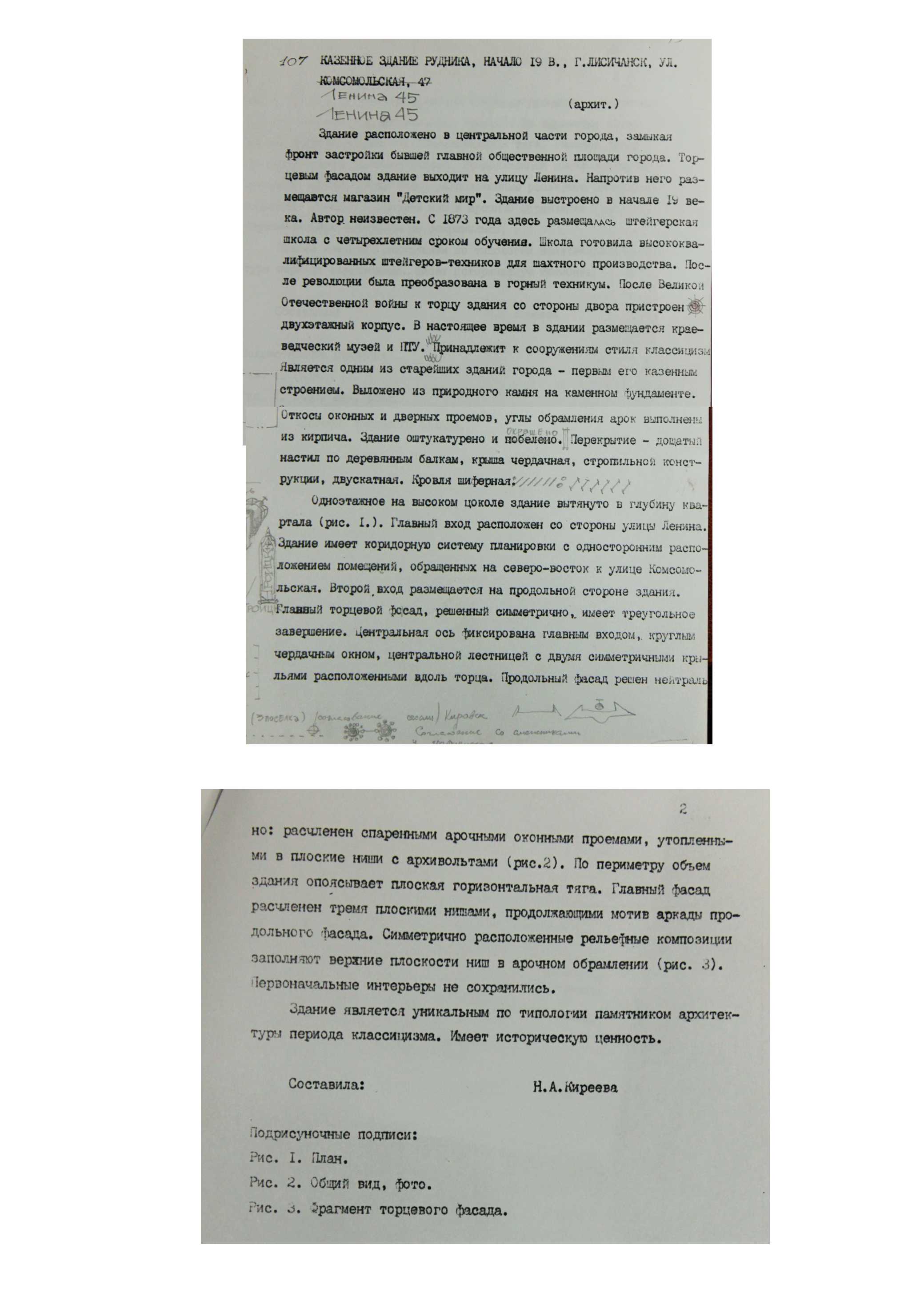 Information about the museum building. The museum is located in the old part of the city of Lysychansk, on the slope of the watershed area, next to the Lysiacha Balka gully, which descends in the southeast direction to the bed of the Siverskyi Donets River. The building that houses the museum has a long history. Data regarding the time of its construction vary. One of the sources indicates the year 18341, whereas the other says it was built in 18422. The records on the building, compiled by N. Kireieva, indicate3 that it dates back to the early 19th century, and that the steiger (mining foreman) school began operating here in 1873 (or, according to Wikipedia, in 1872). As per the information provided by N. Kireieva, at the time of writing the certificate (1995), the building housed a museum of local lore and a vocational school. The premises are built of natural stone on a stone foundation. Slopes, arches and window frames are made of brick. “The building is a unique typological monument of architecture of the classicism period and is historically valuable.”