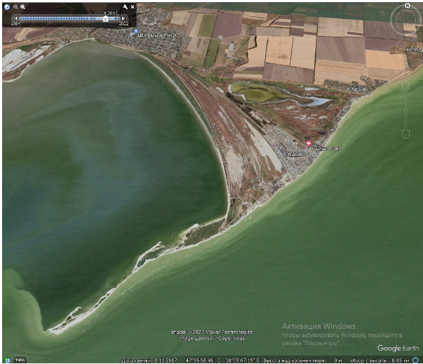 The Obryv (“Precipice”) complex archaeological site is located on the fluvial terrace of Taganrog Bay west of Obryv village of Novoazovsk district. The southern side of the terrace affords a picturesque view of a series of currently degrading coastal estuaries, whose alluvial shores closer to the sea gradually merge, forming Kryva (Crooked) Spit – a modern zoological natural monument of local importance. From the western side, the monument is bounded by the Shyroka gully with a watercourse, which is a source of flowing fresh water. The surface of the terrace is gentle and flat, which makes it convenient for economic activities and housing. Taken together, such conditions probably made this section of the Azov coast attractive for people in the past (pictures 1, 2). According to previous research, virtually the entire, almost five-kilometer-long terrace, including the territory of the present-day village, is the so-called "settlement strip," whose width, as per archaeological explorations, is within 300 meters (1, 2). Archaeological materials from the Neolithic, the Bronze Age, and the Middle Ages have been detected at the monument. Over the course of research, a certain cyclical distribution of locations with uneven percentages of cultural remains dating back to different periods caused individual sites within the monument to be singled out as monuments with their own numbering (for example, Obryv 1, 2, ... 5). Furthermore, on the edge of the terrace, in its middle part, there is a small barrow. In the 1980s, the Donetsk archaeologist A.N. Usachuk conducted archaeological explorations at the settlement. As of now, the majority of its area is built up with modern buildings and is being plowed. Data about the monument are included in the register of archaeological sites of Donetsk region under numbers 6208–6213.