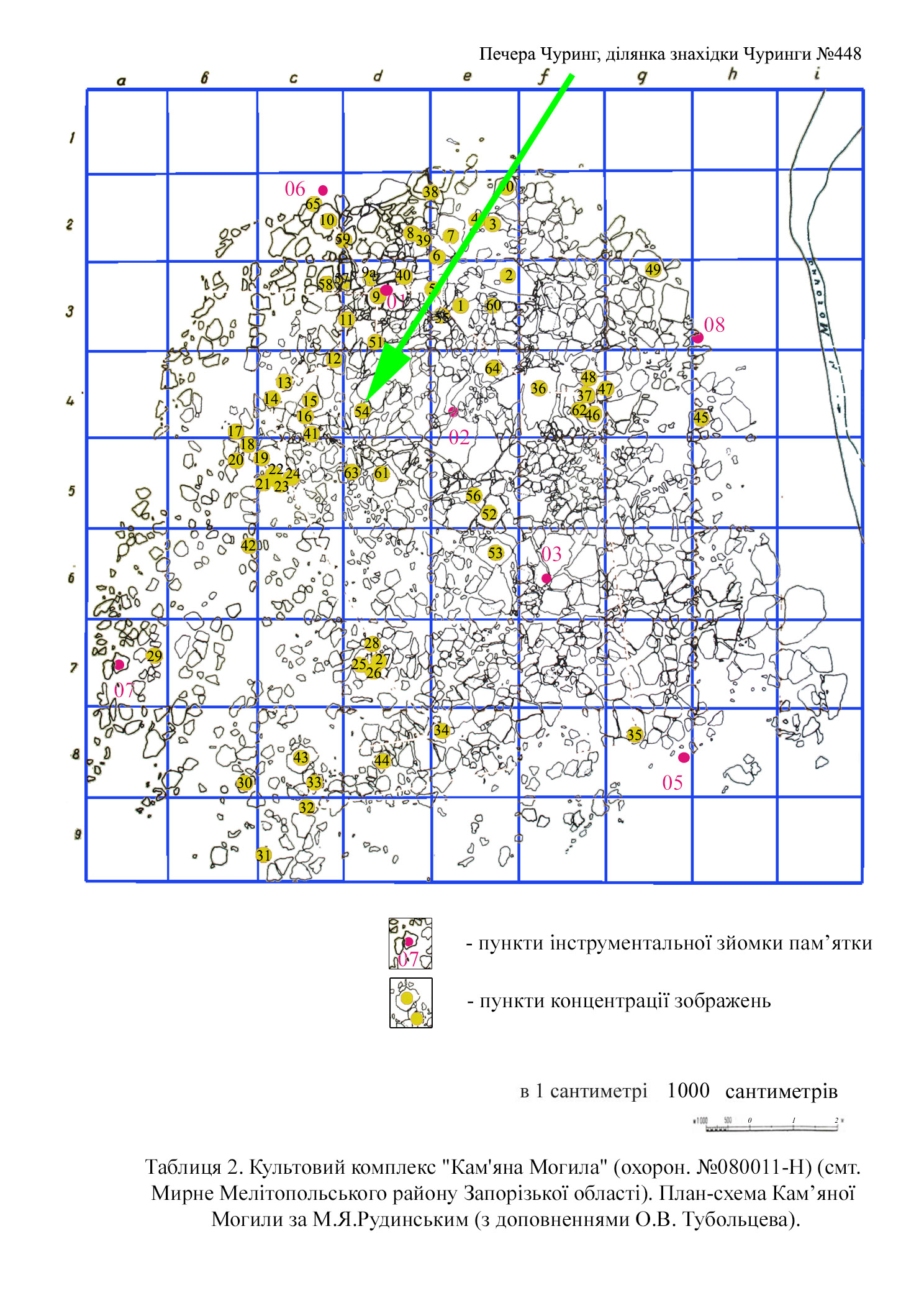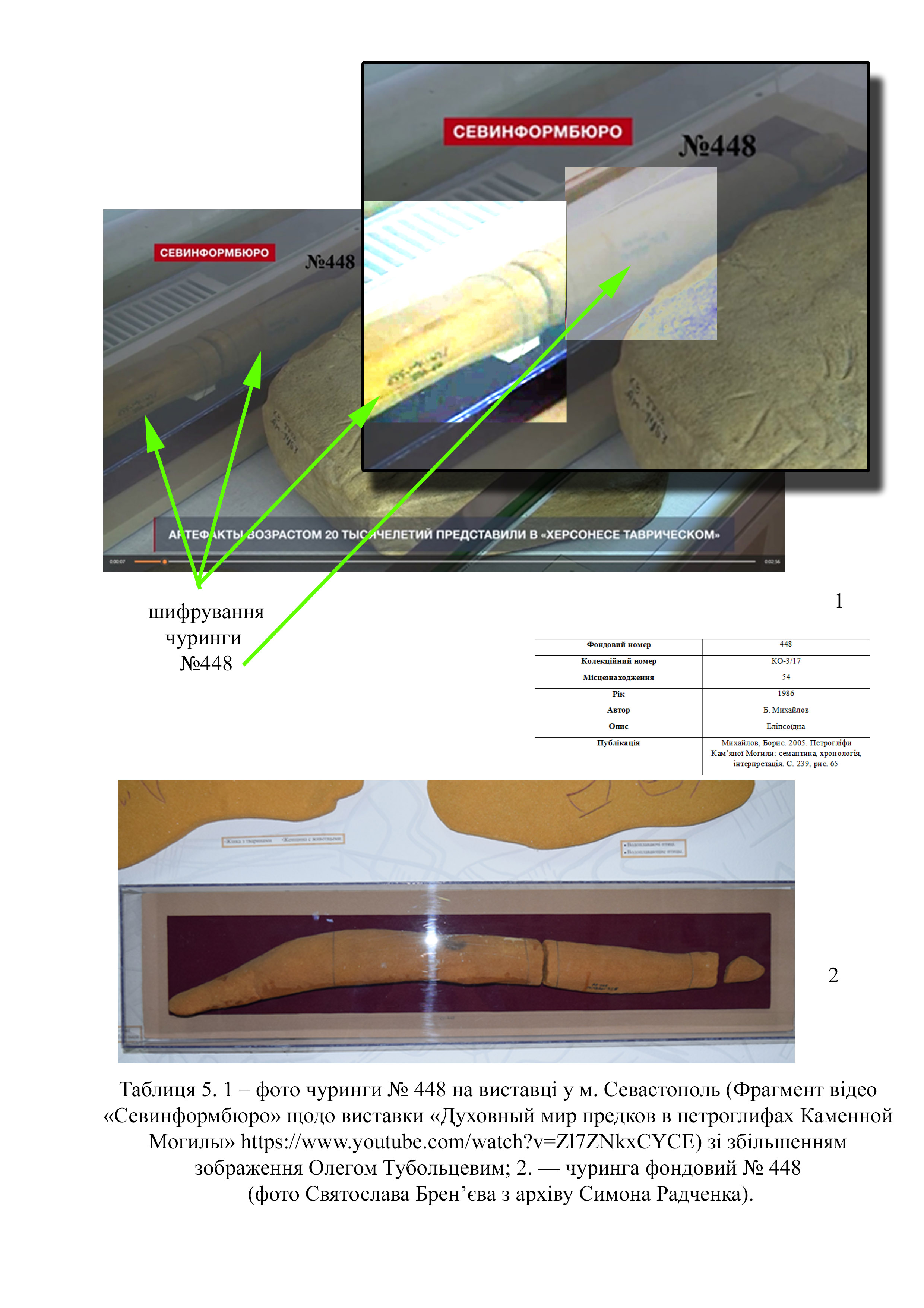 Churinga No. 448 was found by B. Mikhailov in the Churinga Cave in 1986. According to Rudynskyi-Mikhaylov, it is the d4 square of the map, the location is No. 54 (the so-called Churinga Cave) (Table 2). The collection number of the tile is KO-3/17. According to B. Mikhaylov's description, the item is ellipsoidal – a churinga: “It is a two-headed serpentine sculpture with numerous linear-geometric engravings on both sides of its body. One head has an eye and a raised nose, and the other has a flat nose with an eye.” The front and back sides are smoothed (Table 5). General dimensions are as follows: length – 70.4 cm; width – 4.5 cm; thickness – 4.7 cm.