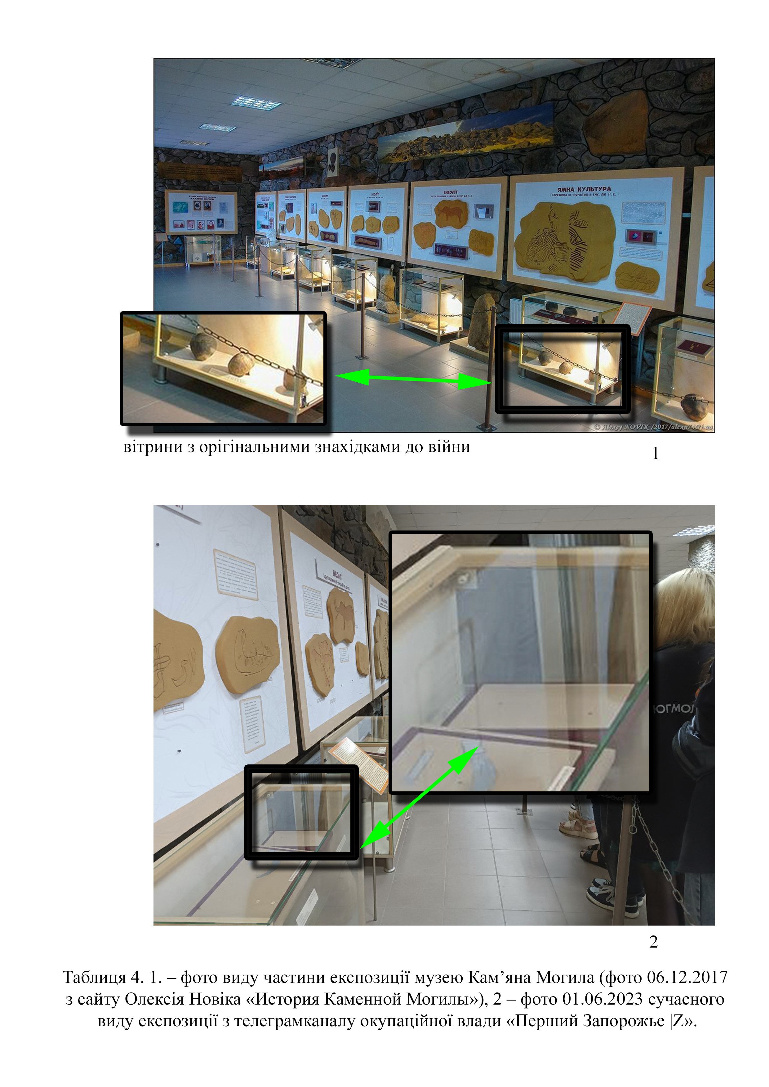 According to online publications, in the city of Sevastopol on May 20, 2023, 120 exhibits were exhibited under the title "Spiritual world of ancestors in the petroglyphs of the Stone Tomb" (https://www.unn.com.ua/ru/news/2028923-u-sevastopoli-vistavili-eksponati-vkradeni-z-muzeyu-kamyana-mogila-pid-melitopolem). In the video and individual photos, only part of the exhibits are clearly visible (Polovtsian (Cuman) stele, pot with an ornament, sandstone samples with algae prints, a mammoth tooth). However, we still do not have all the information about these objects.