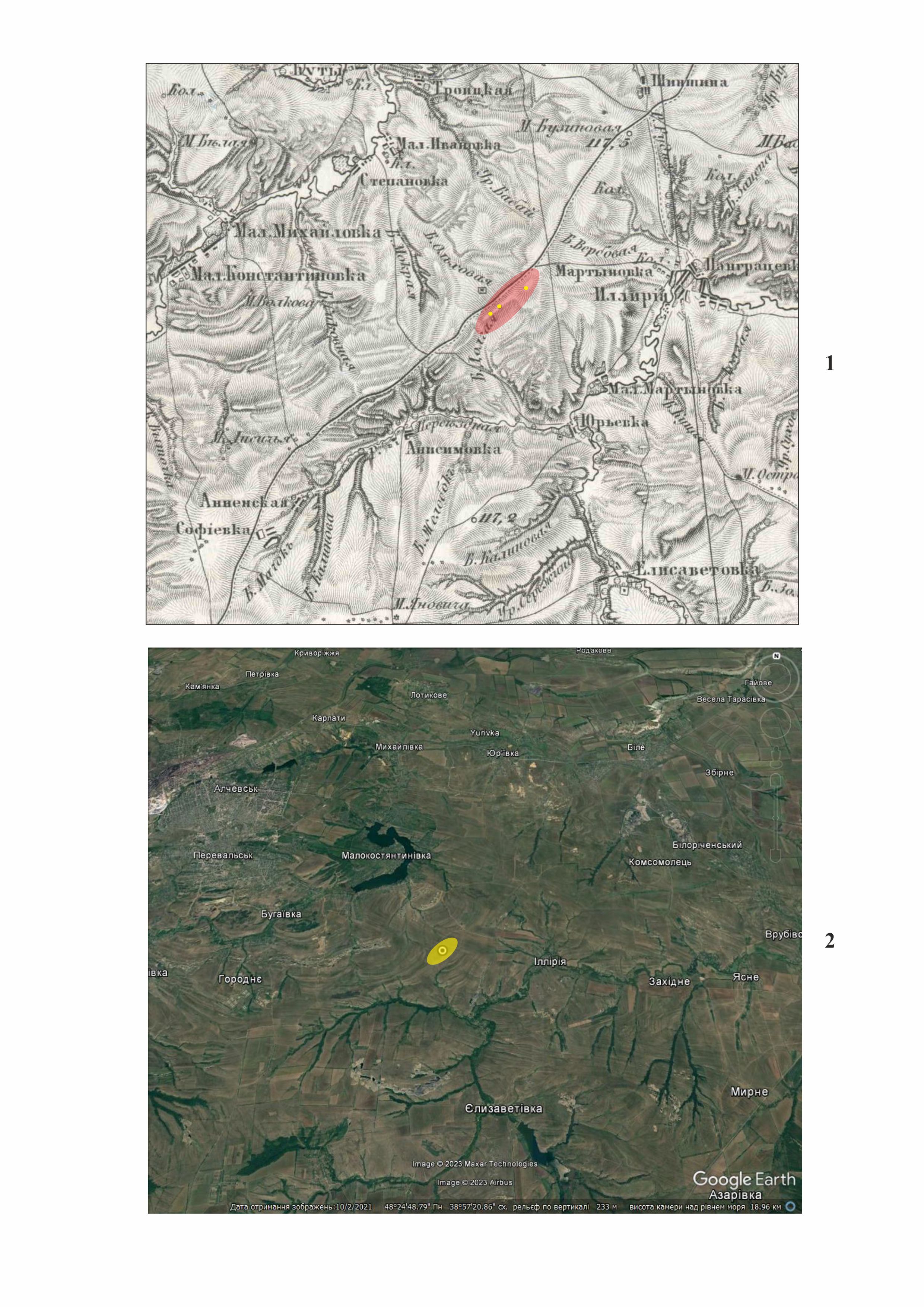 Research history. The complex was discovered by the historical and geographical expedition of the Alchevsk Archeology Fans Club in 2004. In 2005, Doctor of History V. Klochko from the Kyiv-based Science and Research Institute for Monument Preservation Studies led excavations at barrows 2 and 4 and the so-called Ruslan's Tower, named after one of the participants of the expedition, Ruslan Osadchyi; these excavations lasted for four seasons. Schoolchildren from schools of Alchevsk and students from the University of Gdansk also took part in the expedition under the guidance of K. Sliusarska. The expedition discovered a well-preserved cromlech and burials of the Catacomb and Zrubna cultures of the Middle and Late Bronze Age1. To secure special status for his research, V. Klochko spread information that the entire area around the barrows is man-made and viewed the geological features of the area as stone structures. According to the geologists and archaeologists who spoke at a scientific conference in Luhansk in late 2007, there were no artificial structures on the Marl Ridge, apart from ordinary barrows1. However, considering the unique natural landscape and the presence of two more unexplored barrows, this area has always attracted tourists and connoisseurs of local lore. Taking into account the fact that V. Klochko's expedition was financed from the budget of the Luhansk Regional State Administration, the Department of Culture was developing a tourist route until 2014. To visualize the ancient burial object, the structural elements of barrow 4 were left unconserved, which is clearly visible in satellite images (3, 4). It should also be said that, to the east of the archaeological complex between the villages of Illiriia and Zahidne, the Illirian general zoological reserve of local importance is located (created by the decision of the Luhansk Regional Council of People's Deputies No. 4/19 of December 15, 1998). Its total area is 3074.5708 hectares.