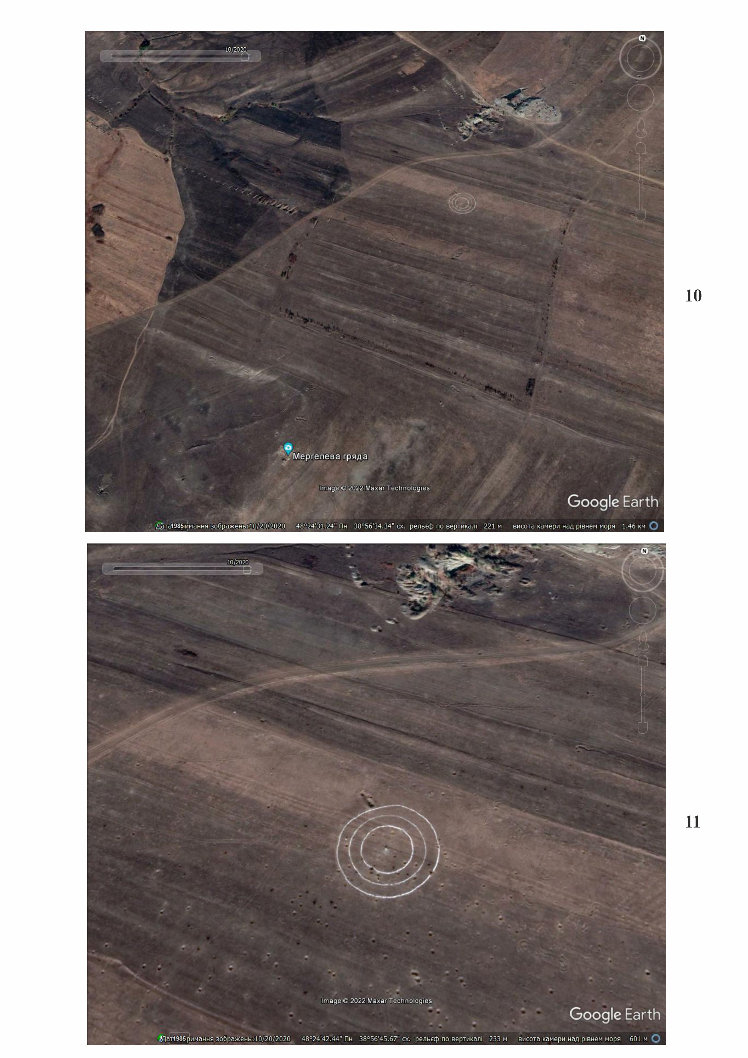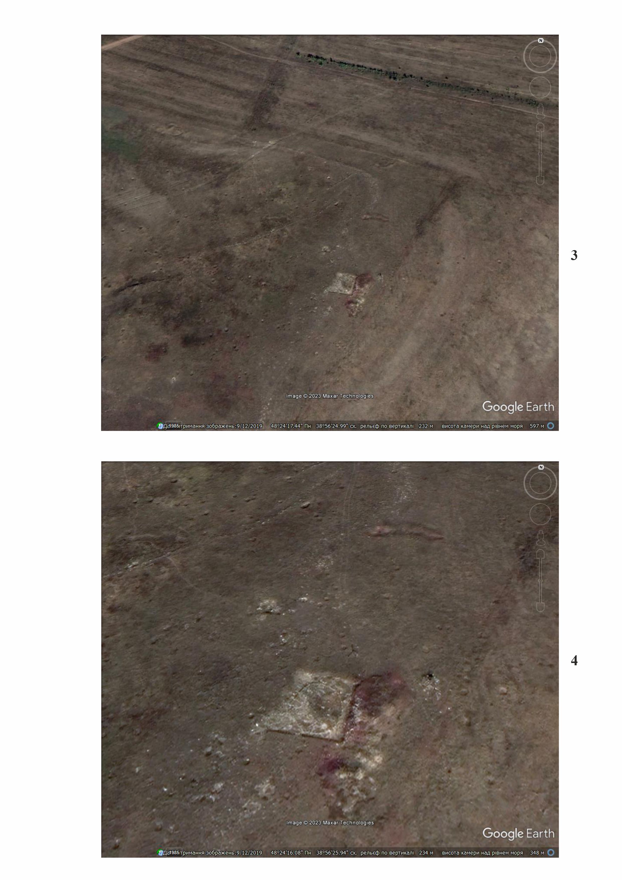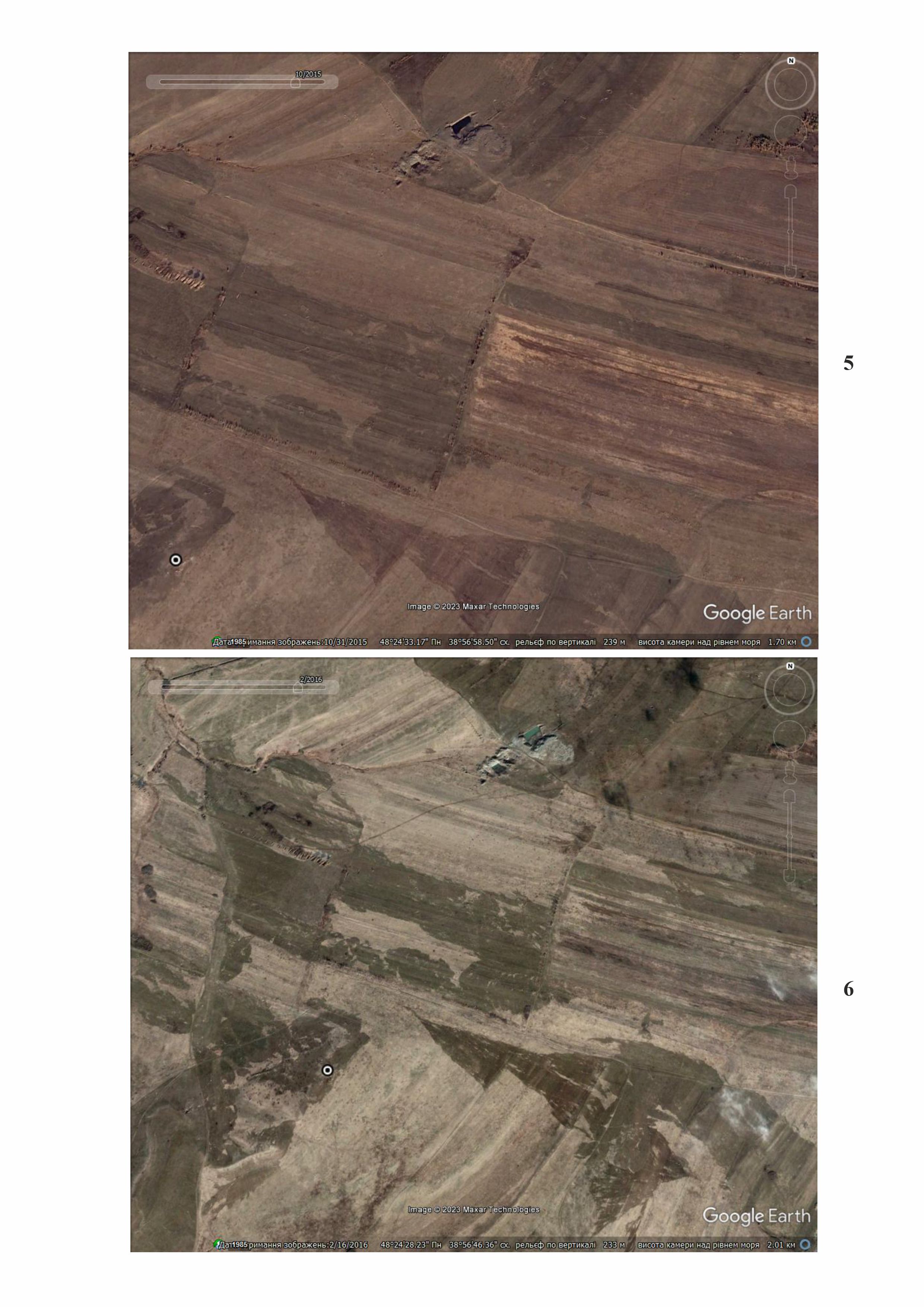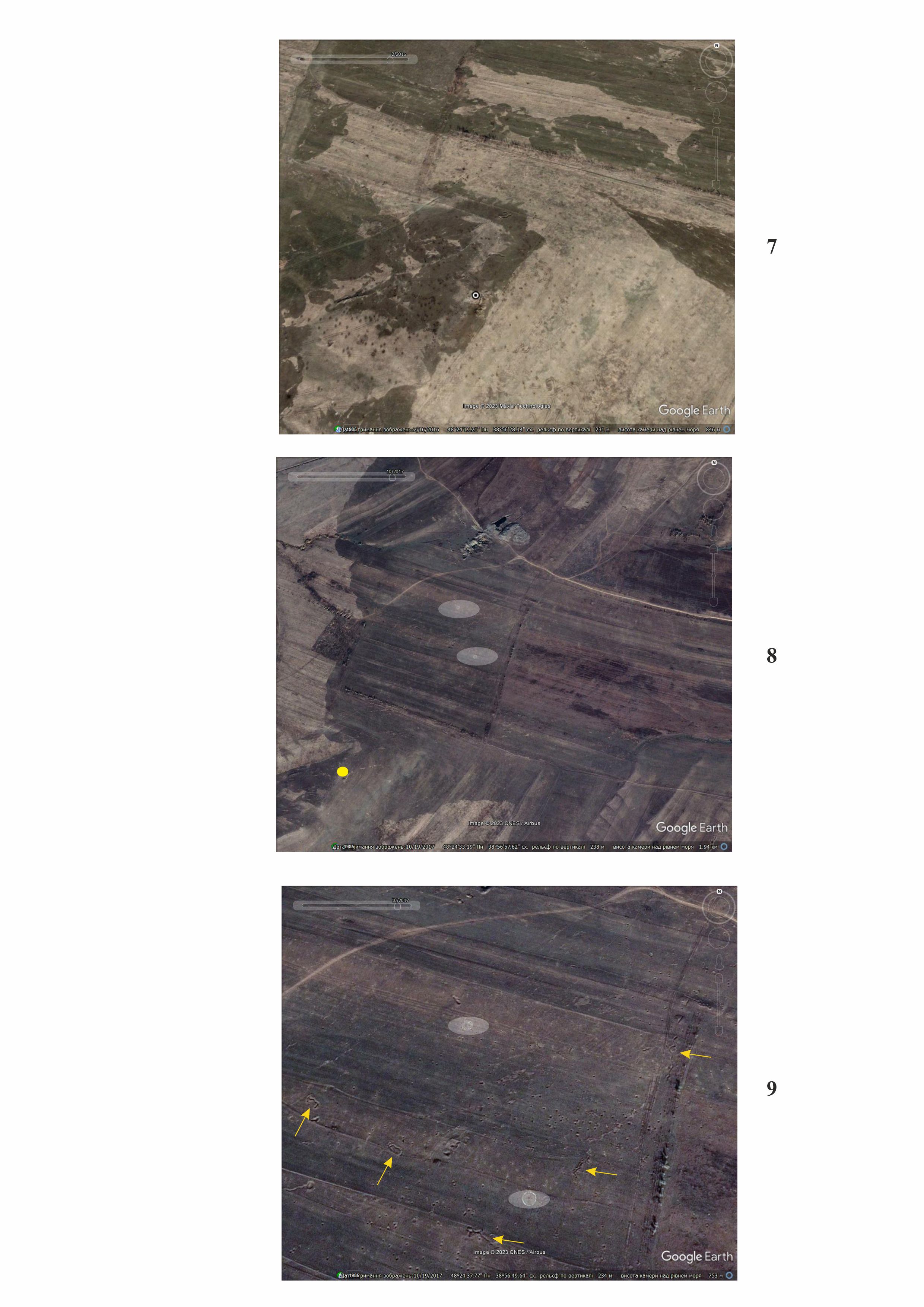Occupation of Luhansk region. Since 2014, this part of Luhansk region has been occupied. As of October 2015, the area around the site had no signs of damage (5). But already in the next image, which dates from February 2016, one can see numerous traces of explosions directly at the excavation site, where ancient stone structures were open for viewing, and around it (6,7). The territory of the archaeological complex began to be used as an artillery firing range. In the image dated October 19, 2017, one can see ground targets located 736 and 885 meters northeast of the complex; just 75 and 155 meters northeast of the barrow, four trenches are visible (8, 9, 10, 11).