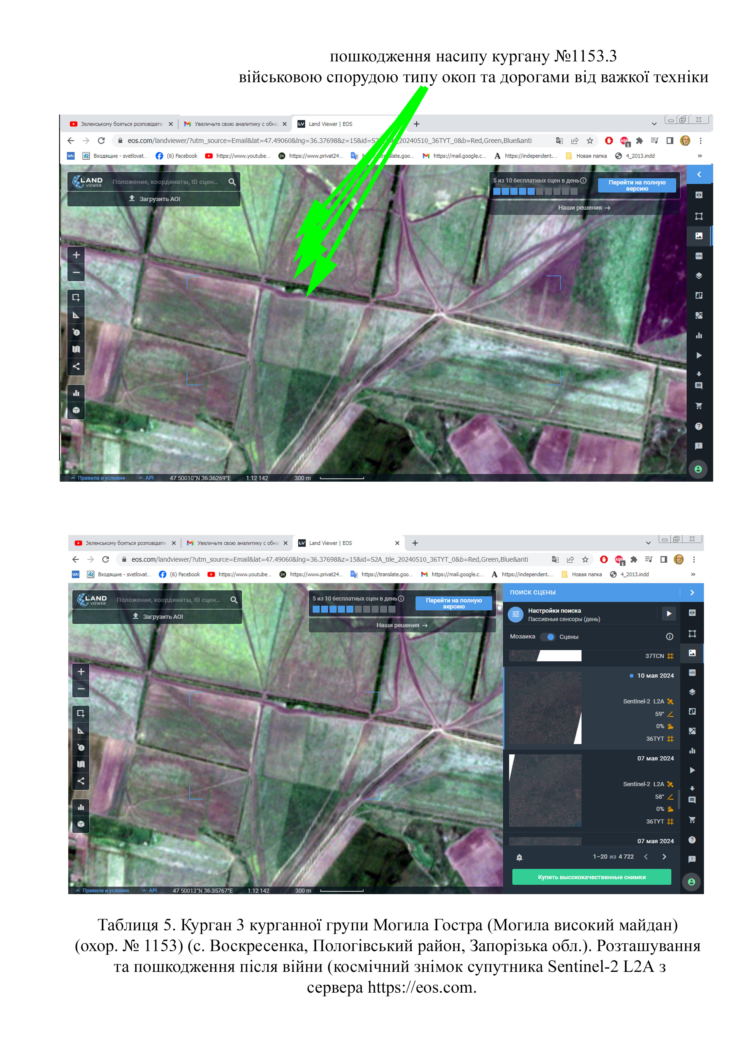 З сучасних космічних знімків від 10.05.2024 р., зроблених супутником Sentinel-2 L2А (сервер https://eos.com), видно сильне пошкодження окопами та дорогами (важка техніка) поли насипу 1153.3 (Табл. 5).