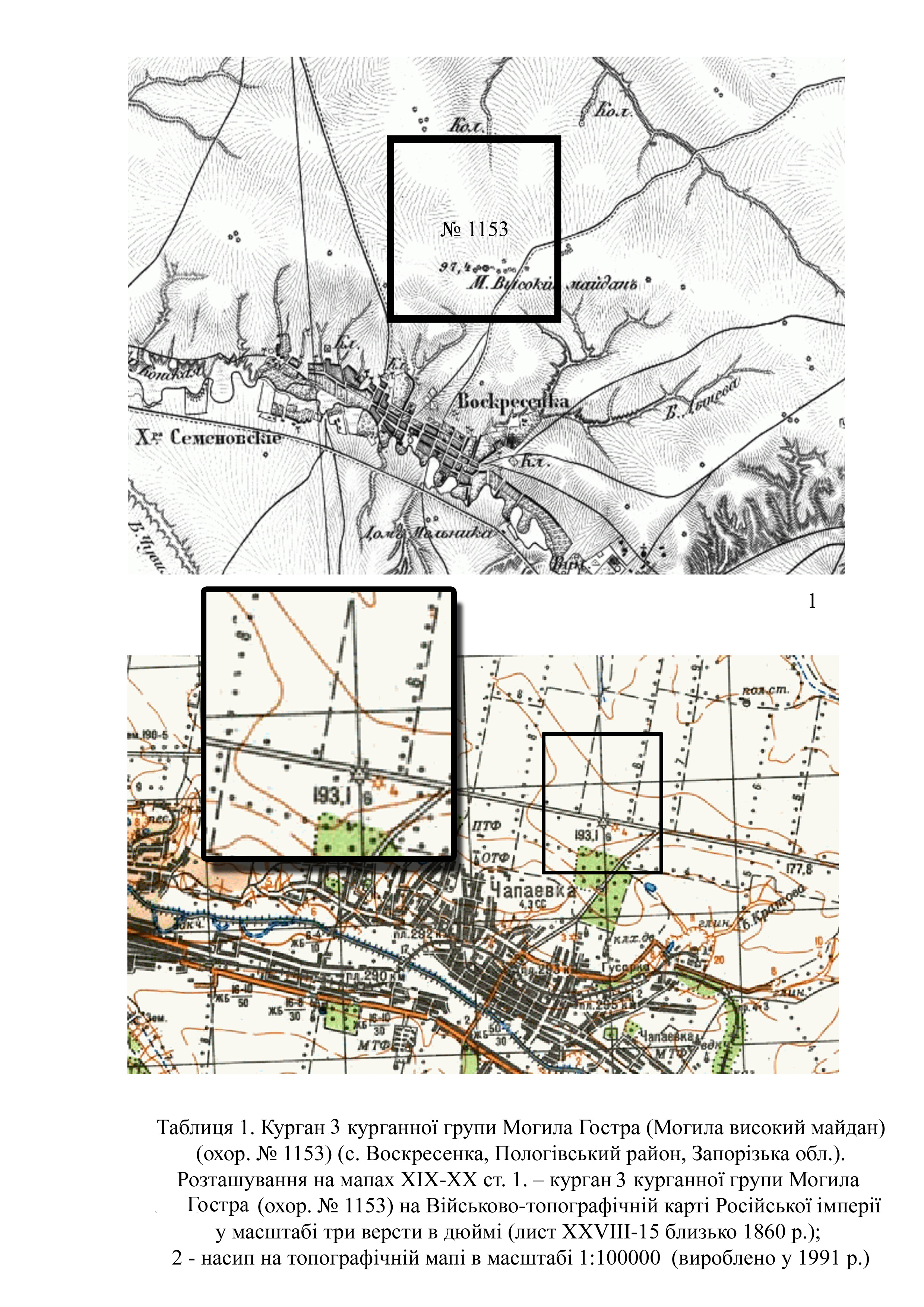 Територія біля Великого Лугу має величезну кількість курганних могильників (Табл. 1). Терміни “курган” або “могила” означають округлий або довгий земляний насип, зведений над одним чи кількома похованнями. Перші кургани почали з’являтися в степовій зоні Північного Причорномор’я в IV тис. до н.е. та проіснували до перш. пол. ІІ тис. н.е. Тривале використання таких насипів як могильників зумовило появу курганних груп. Кургани містять нашарування декількох історичних епох. Поховання, здійснені на різній глибині, розділяють на основні та впускні. Кожного разу курган досипали, на його верхівці встановлювали кам’яні стели, дерев’яні стовпи, неодноразово курган використовували під час тризни – обряду, пов’язаного із вшануванням душ похованих предків.