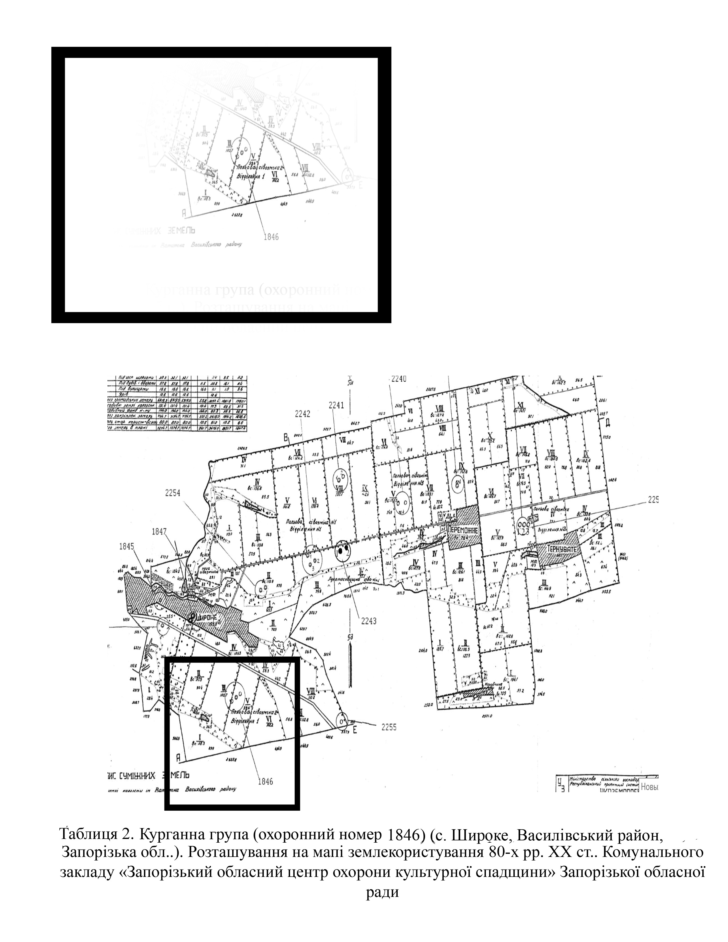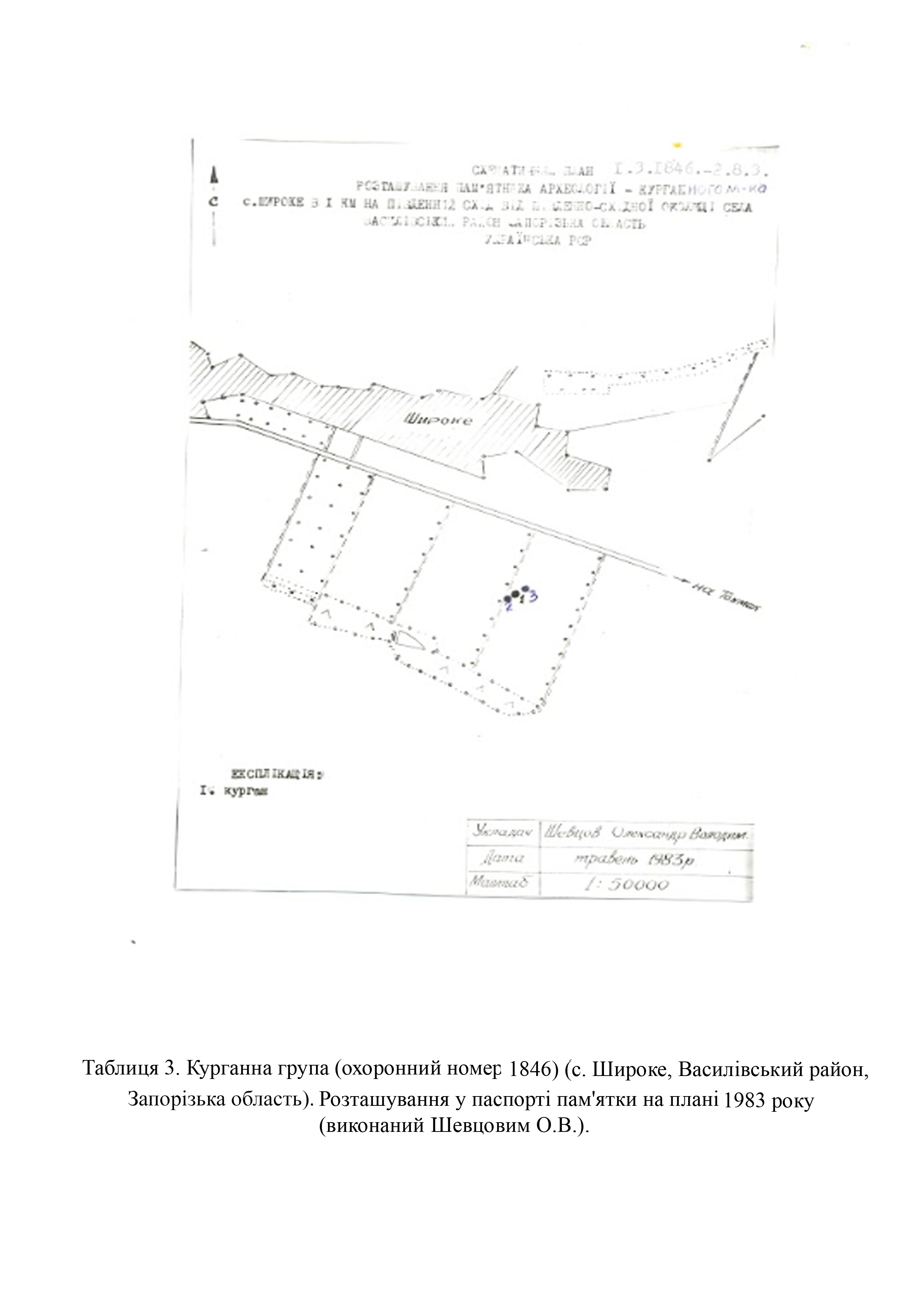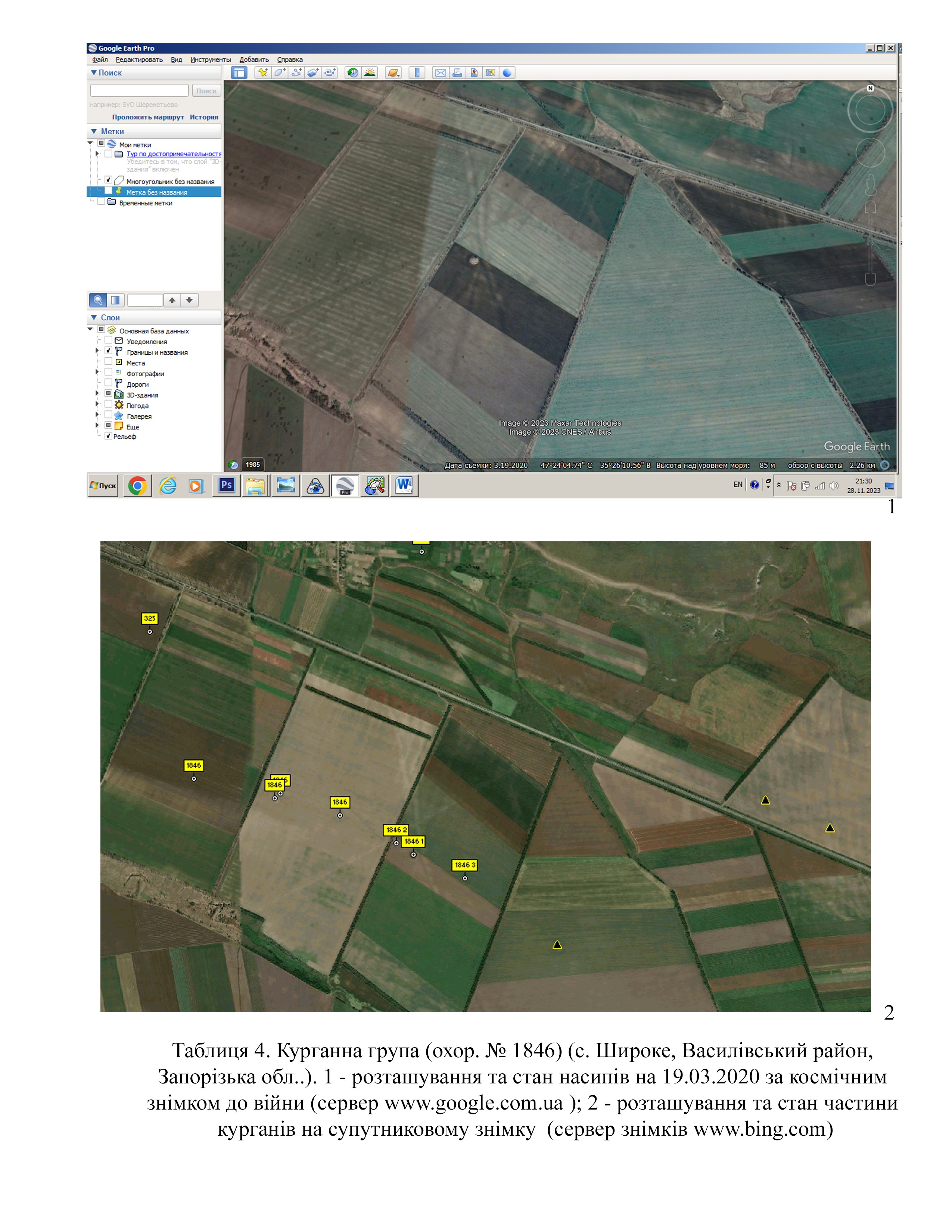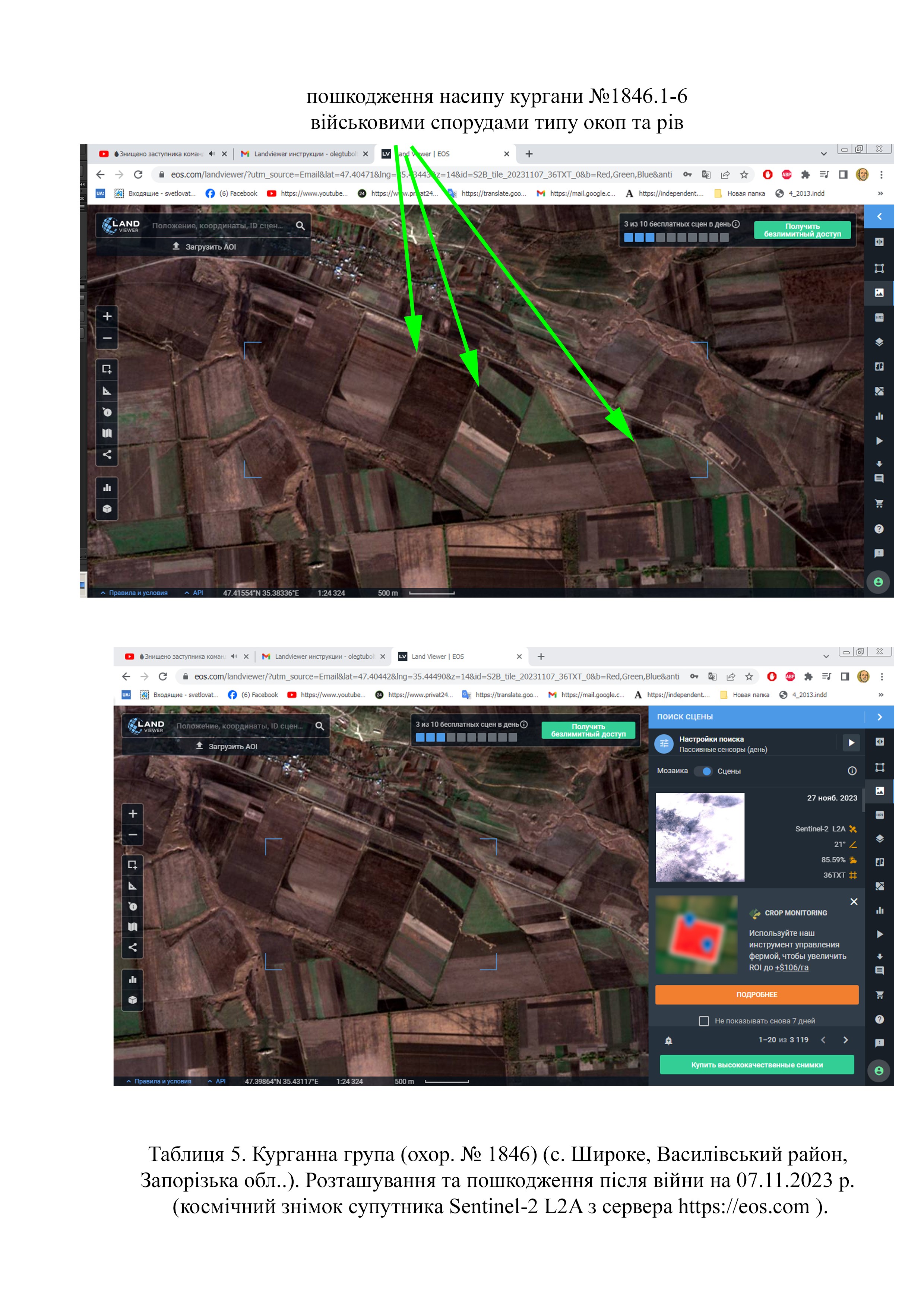 Завдяки знімкам високої якості (космічний знімок 07.11.2023 р. супутника Sentinel-2 L2A з сервера https://eos.com), удалося встановити, що на курганах 1846.1-3, зруйновано частину поли через розташування тут окопів та рову (Табл. 5).