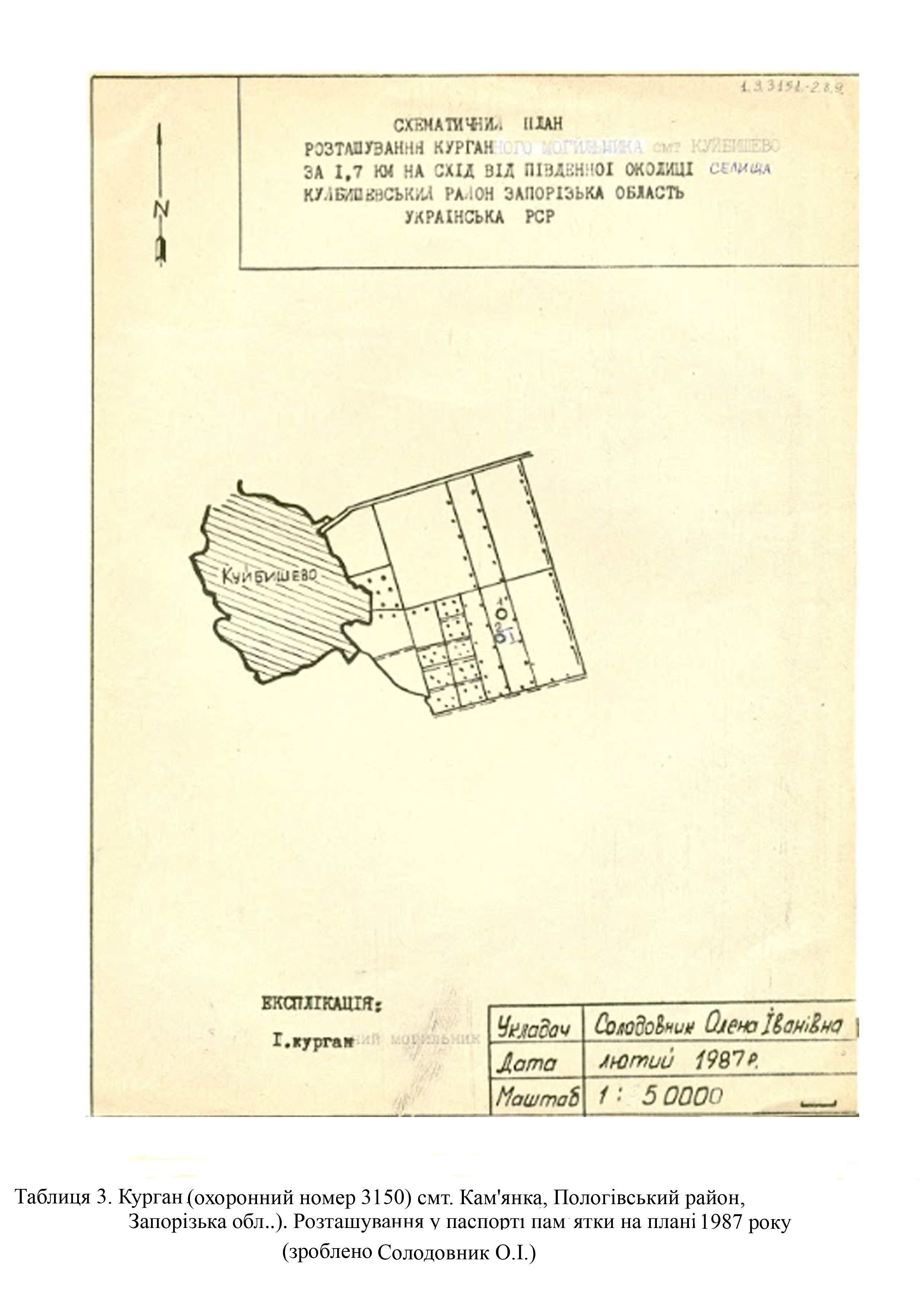 Курган (охор. № 3151) вперше обстежив доцент Запорізького державного педагогічного інституту Тощев Г. М. у 1987 році. (Табл. 2; 3).