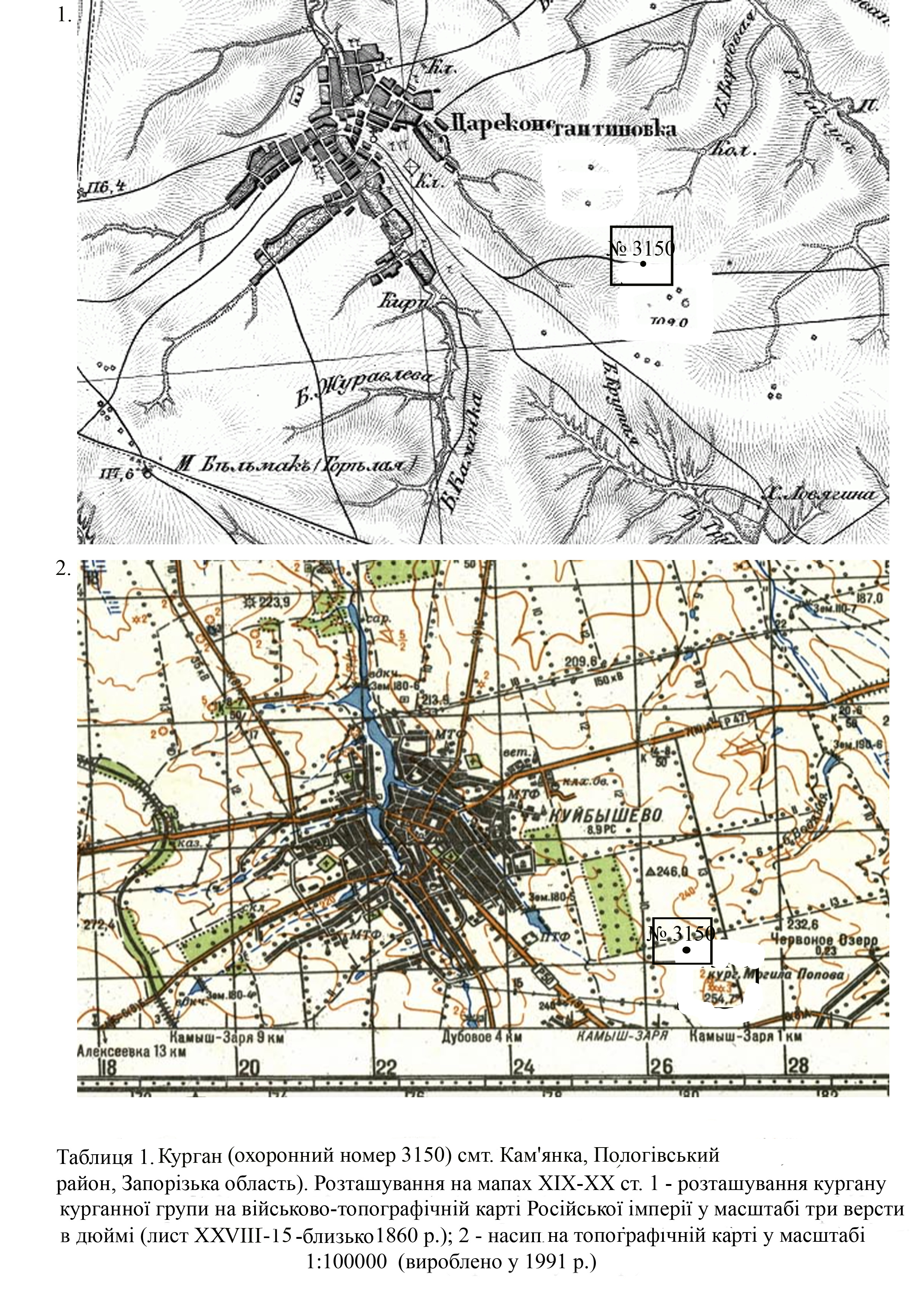 Територія біля Великого Лугу має величезну кількість курганних могильників (Табл. 1). Терміни “курган” або “могила” означають округлий або довгий земляний насип, зведений над одним чи кількома похованнями. Перші кургани почали з’являтися в степовій зоні Північного Причорномор’я в IV тис. до н.е. та проіснували до перш. пол. ІІ тис. н.е. Тривале використання таких насипів як могильників зумовило появу курганних груп. Кургани містять нашарування декількох історичних епох. Поховання, здійснені на різній глибині, розділяють на основні та впускні. Кожного разу курган досипали, на його верхівці встановлювали кам’яні стели, дерев’яні стовпи, неодноразово курган використовували під час тризни – обряду, пов’язаного із вшануванням душ похованих предків.