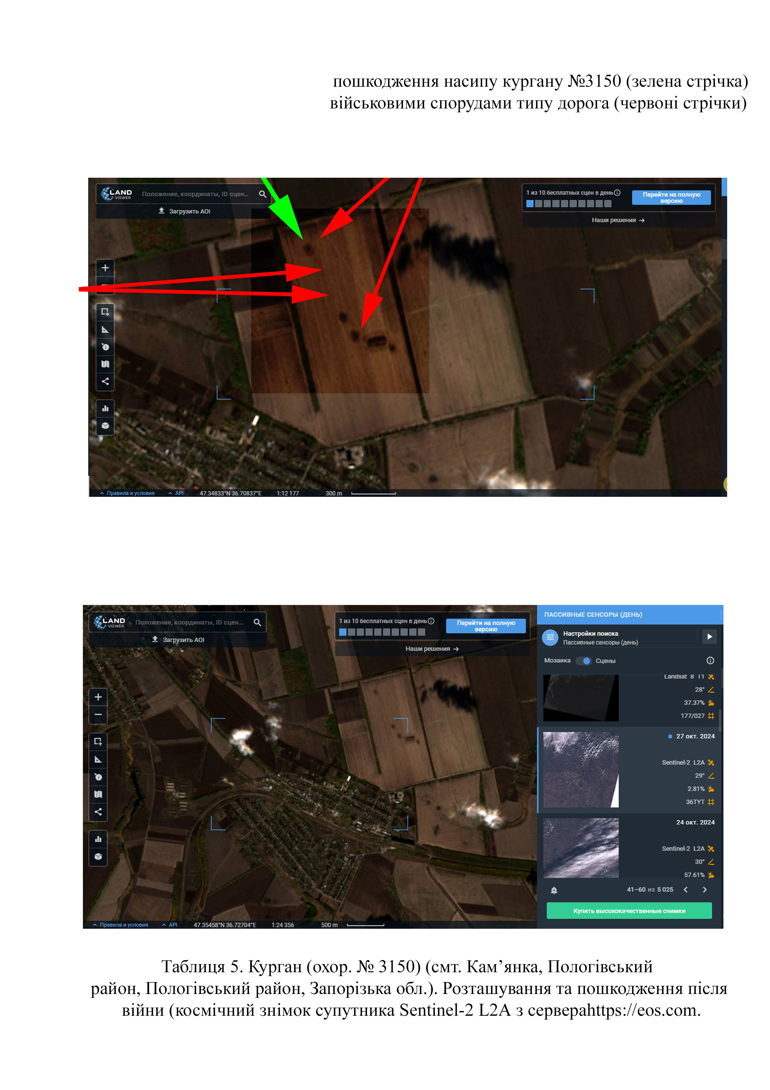 З сучасних космічних знімків, зроблених супутником Sentinel-2 L2А від 27.10.2024 р. (сервер https://eos.com), видно, що насип кургану пошкоджено дорогою (Табл. 5).