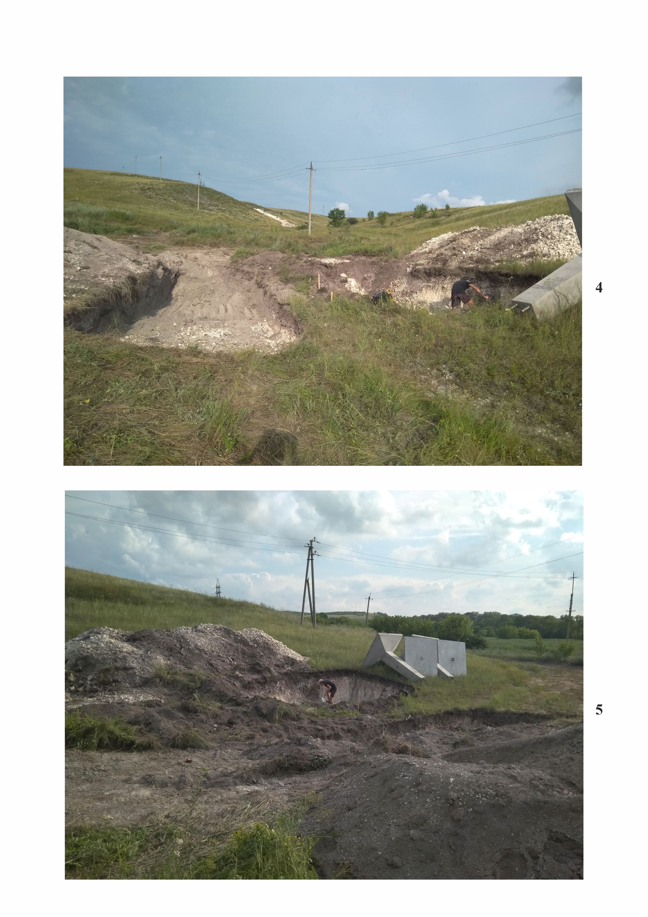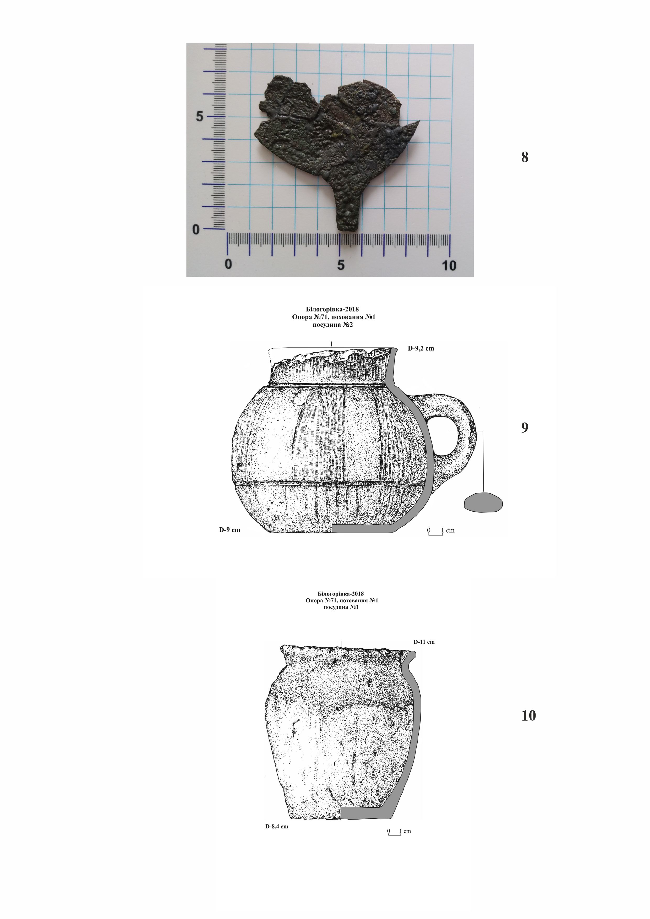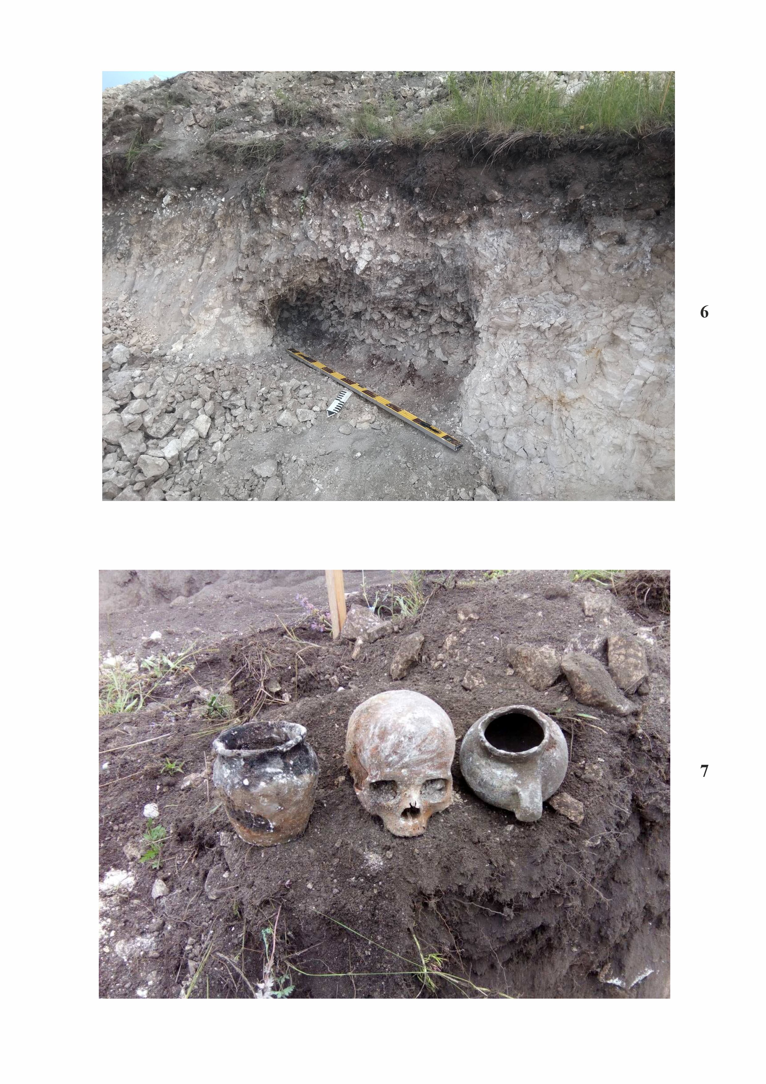 У південно-західній частині котловану для встановлення опори площею 40м2 і виявлене поховання, яке було частково зруйновано під час роботи землерийної техніки, – череп, ріг кози, два горщики та частини бронзового люстерка, які розташовувалися поблизу нього, випали та були переміщені в більш безпечне місце. Гомілкові кістки не вдалося дослідити, оскільки існувала небезпека обвалу ґрунту. Судячи зі стратиграфії, поховання було здійснене в підпрямокутній ямі розмірами 2х0,65 м, виритій у крейді та орієнтованій довгою віссю з північного заходу на південний схід. Поховальна яма фіксувалася на глибині 0,8 м від денної поверхні, а скелет лежав на підрубленій поверхні крейди на глибині 1,37 м. Короткі сторони ями заокруглені. Вийнятими конкреціями мергелю поховальну яму було і закладено. На денній поверхні поховання не виділялося. Похований знаходився у випростаному стані на спині, головою на північний захід. Кістки рук витягнуті вздовж тіла. Могила була оздоблена деревиною.