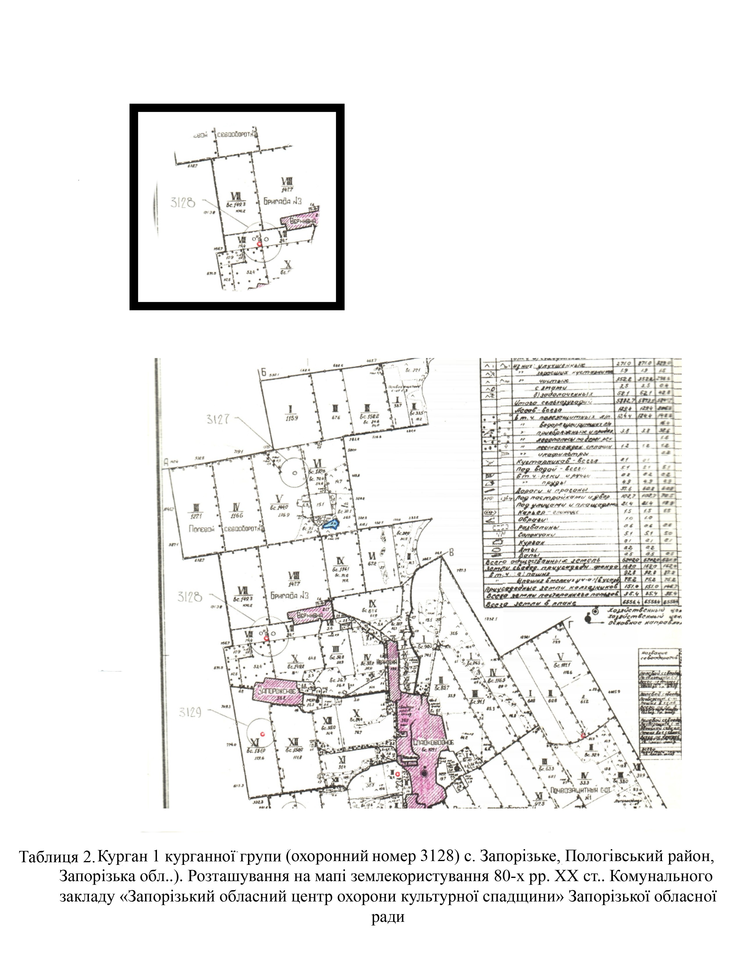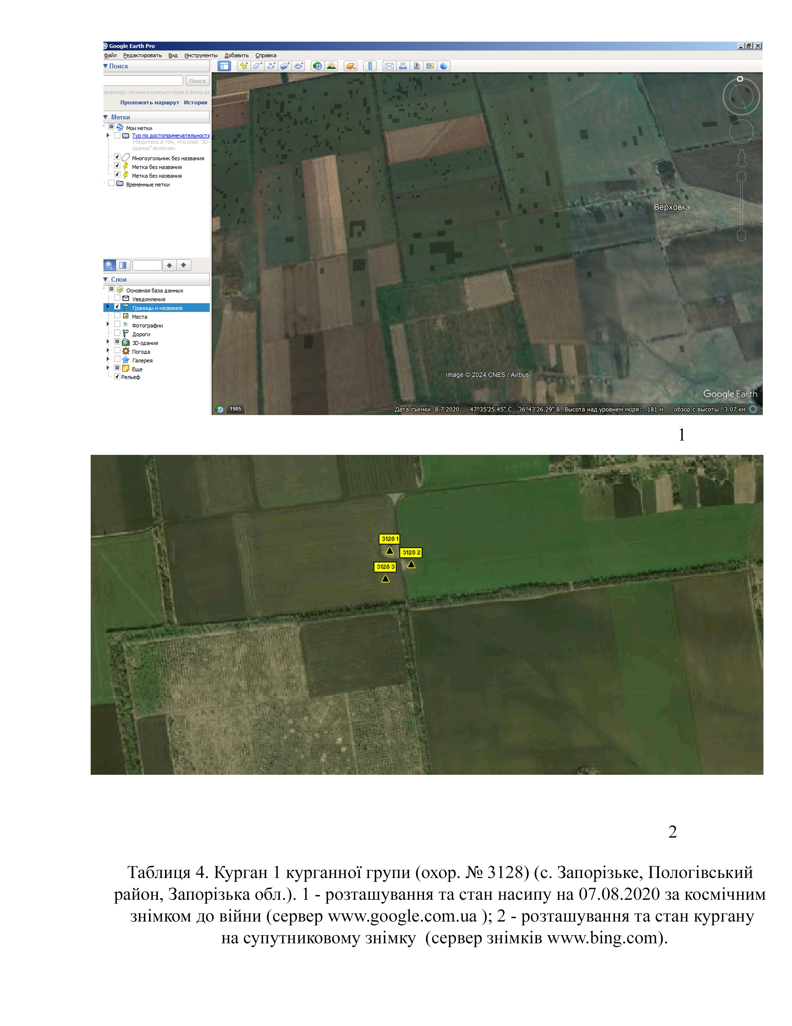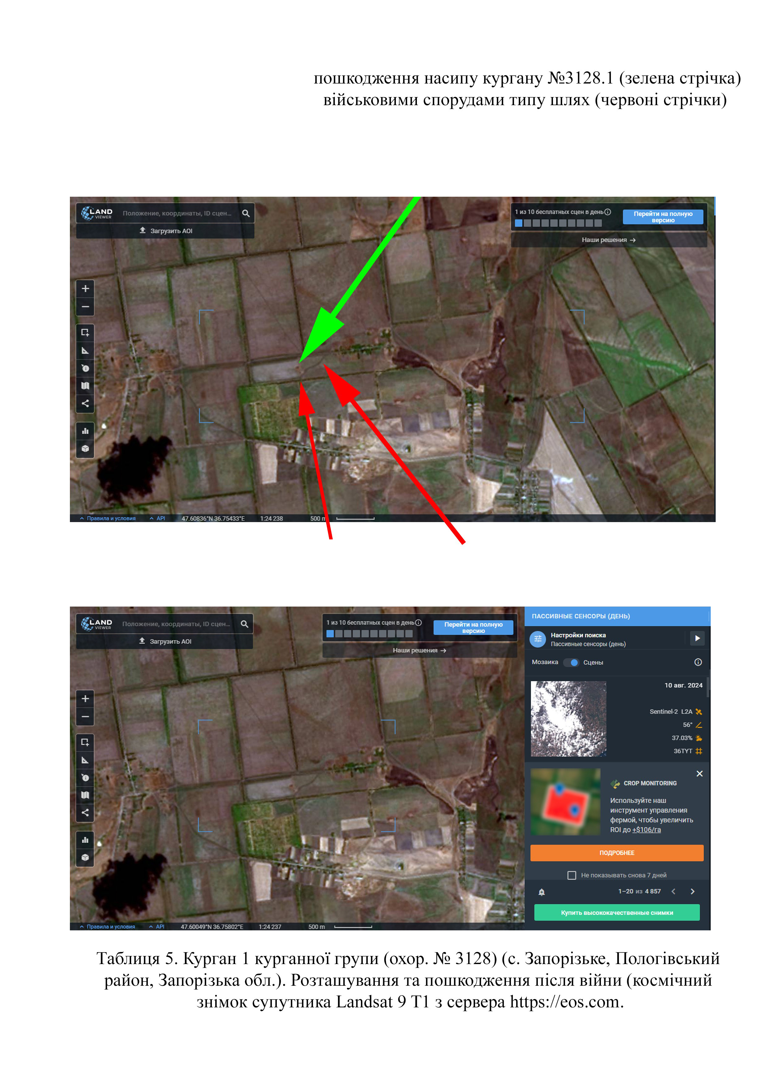 Завдяки знімкам високої якості можна встановити, що на кургані № 3128.1 зруйновано частину поли через розташування тут дороги (Табл. 5) (космічний знімок супутника Landsat 9 T1 з сервера https://eos.com на 09.08.2024 р.).