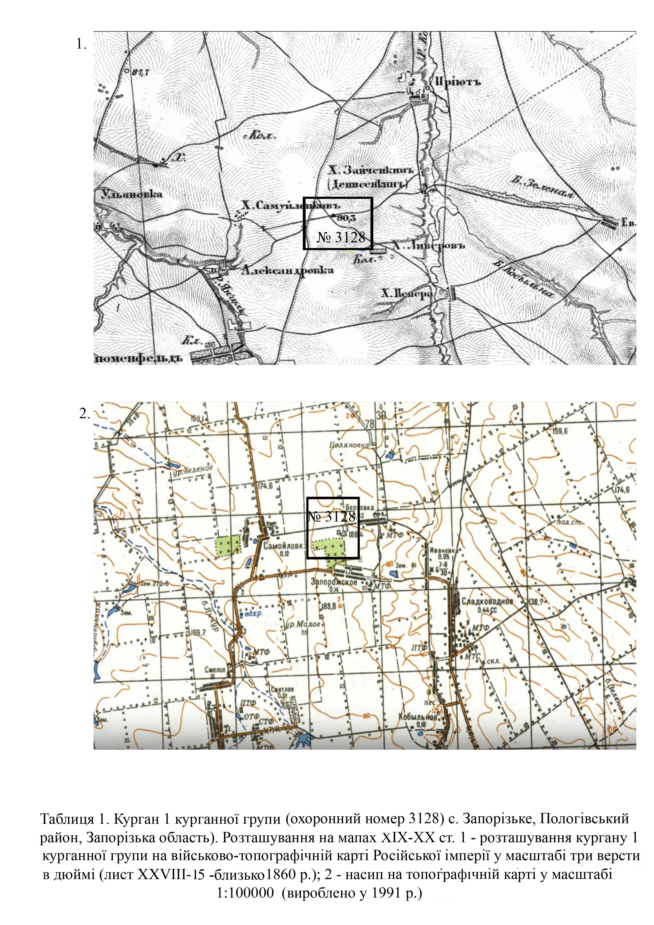 Курган 1 курганної групи (охор. № 3128) вперше обстежили в 1986 р. співробітники Запорізького державного педагогічного інституту Тощев Г. М. та Андрух С. І. (Табл. 2; 3).