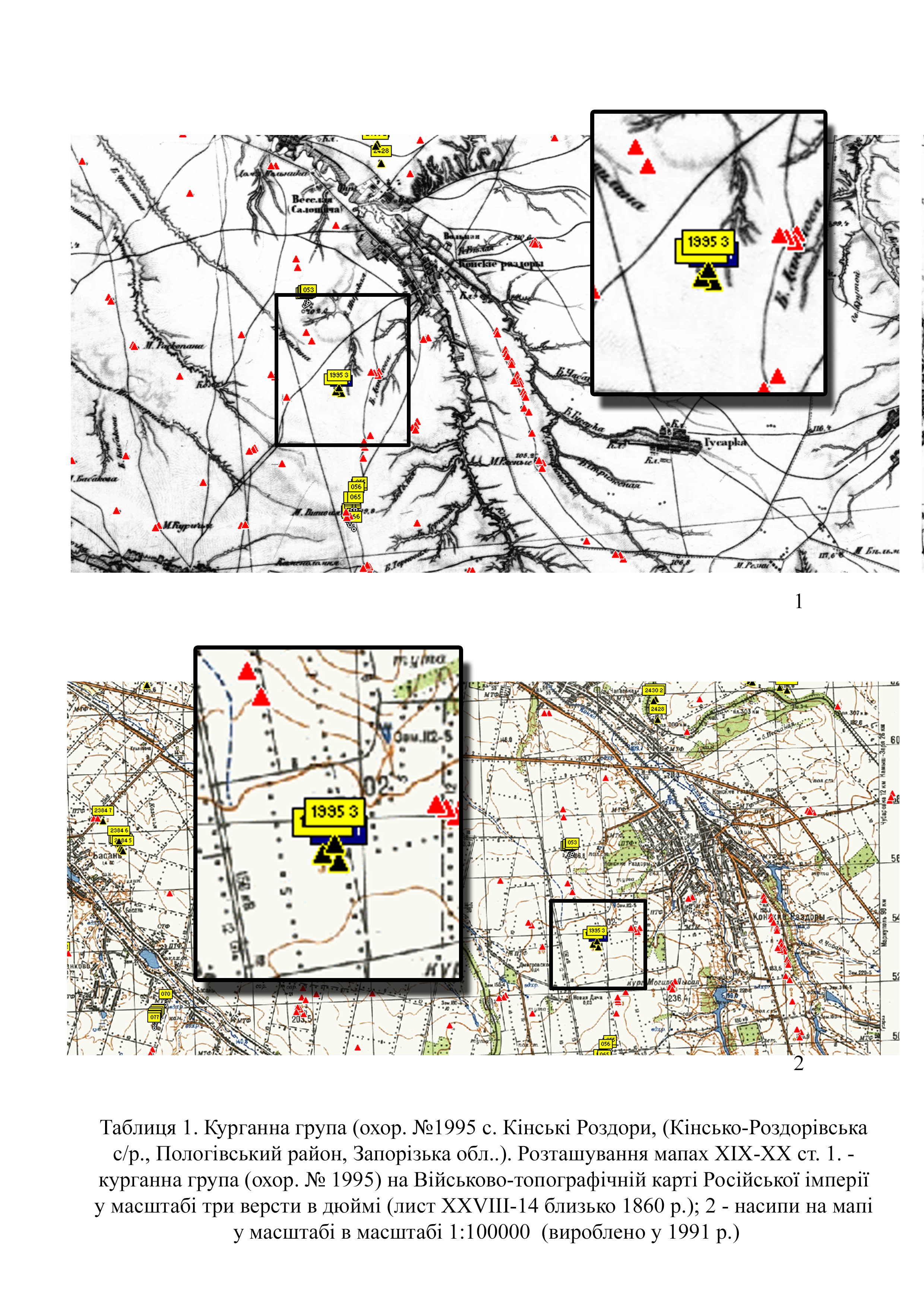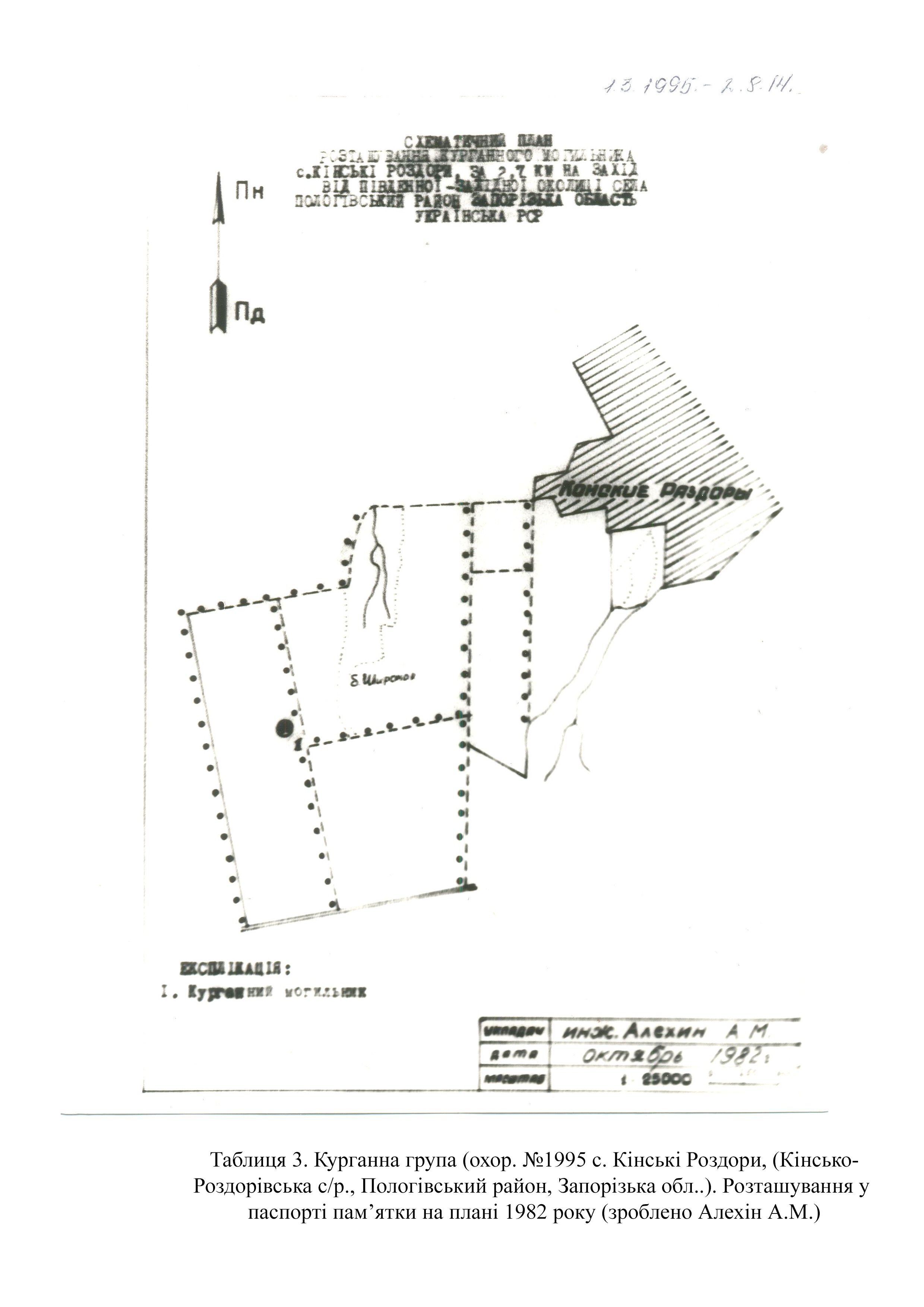 Курганну групу (охор. № 1995) вперше обстежив у 1982 рр.. науковий співробітник Запорізького обласного краєзнавчого музею Альохін А. М. (Табл. 2; 3)