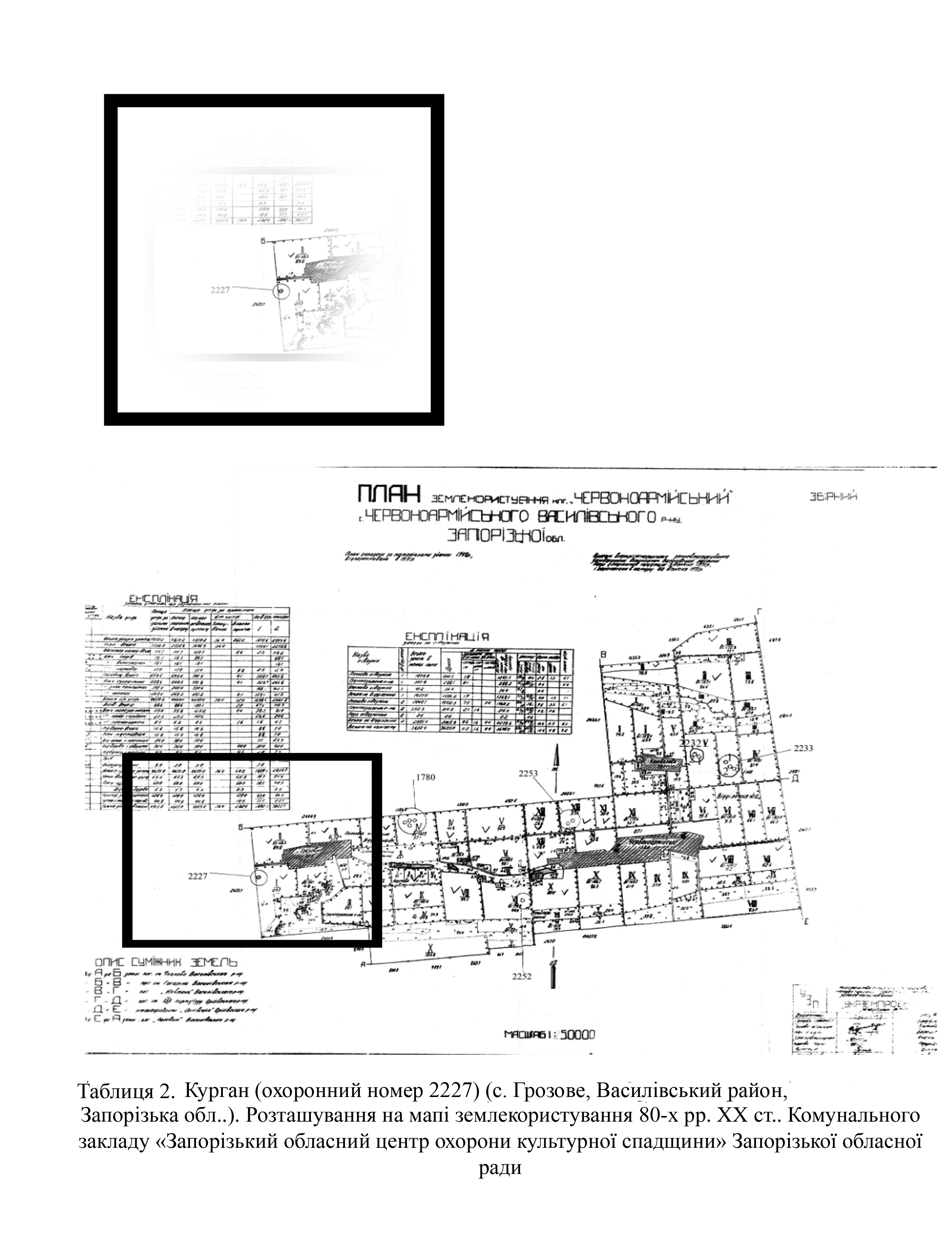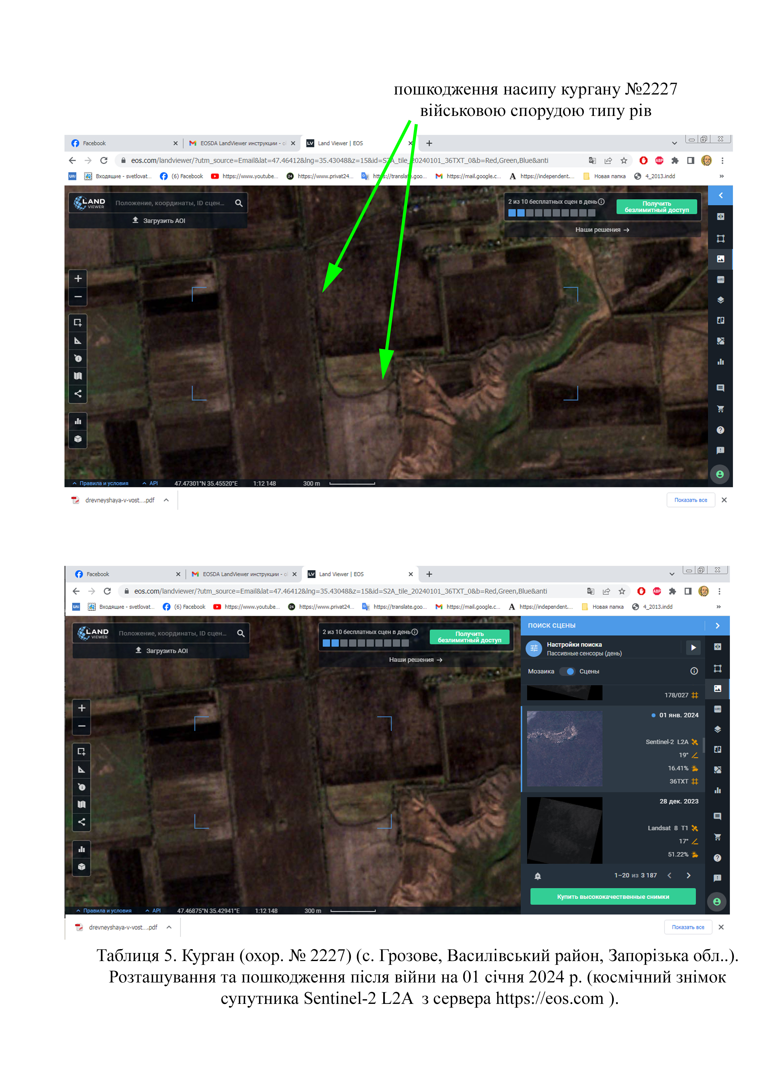 Завдяки знімкам високої якості, можна встановити, що полу насипу кургану №2227 зруйновано через розташування тут та поруч рову (Табл. 5).