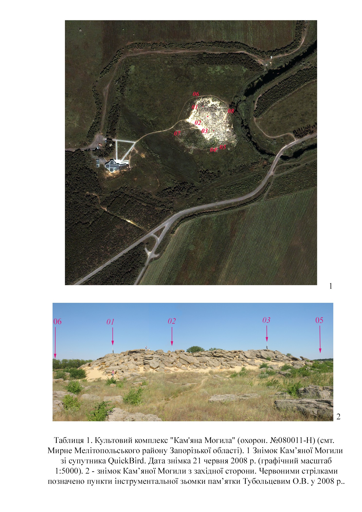 Кам’яна Могила – унікальна пам’ятка археології та історії давнього мистецтва та релігії. Центральний комплекс складається з 11-ти метрового панцероподібного пагорба з пісковику, який зберігає входи до печер та гротів. За даними вчених, тут виявлено близько 68 місцезнаходжень із зображеннями різних епох (Табл. 1, 2). У 60-х роках Кам’яна Могила отримала статус пам’ятки місцевого значення (Постанова Ради Міністрів Української РСР № 711 «Про затвердження списку пам’ятників мистецтва, історії та археології Української РСР») (охорон. № 33). Користувачем призначено історико-археологічний заповідник «Кам’яна Могила». Головна наукова тема музейної експозиції — відображення етапів історії розвитку мистецтва. Першу фондову колекцію формували співробітники ІА НАН України, серед яких необхідно назвати таких відомих вчених, як Бадер О. М., Рудинський М. Я., Гладилін В. М., Даниленко В. М. (Бадер, 1949; Рудинський 1961; Гладилін, 1964; Михайлов, 1994)