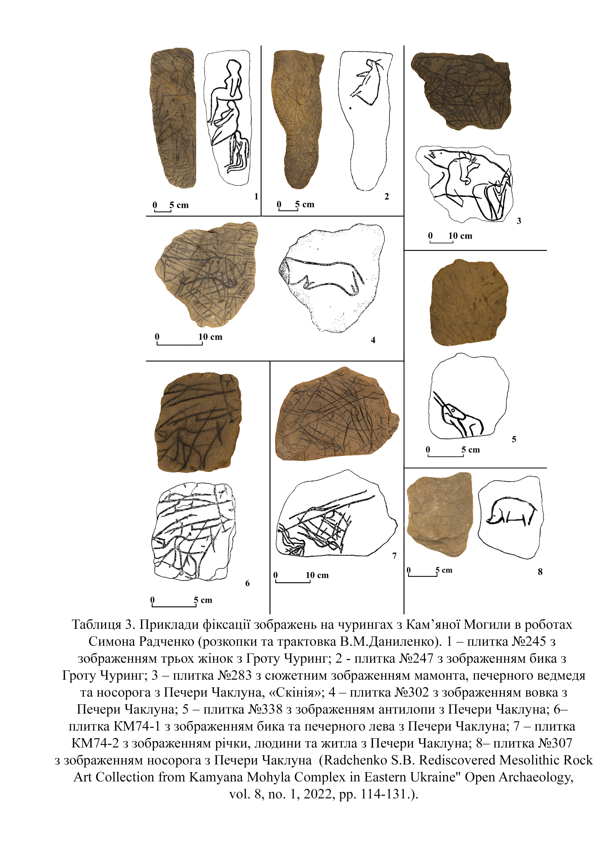 За публікаціями Даниленка В. М., тільки в сезоні 1973 р. під час розкопок на пагорбі Кам’яна Могила, в гротах Чаклуна, чуринг знайдено близько 80 таких, схожих одна на одну, ретельно оброблених «плиток-чуринг» (Даниленко, 1986, с. 94—129). Автор підкреслює складний, прокреслений орнамент сторін виробів (Табл. 3). Серед деяких з них він бачить зображення «людини з рогами» та плейстоценовой тварини (мамонт, носоріг) (Даниленко, 1986, с. 95—98). Останній факт вказує на архаїчний характер частини плиток. У монографії Михайлова Б. Д. цих виробів більше (Михайлов знаходить ще близько 230 таких об’єктів). Він погоджується з порівняльною датою, але критикує термін «чуринги» як невдалий. На його думку, зображення на окремих блоках Кам’яної Могили пов’язано тільки з відображенням духів тварин та людей (Михайлов, 1994, с. 135).