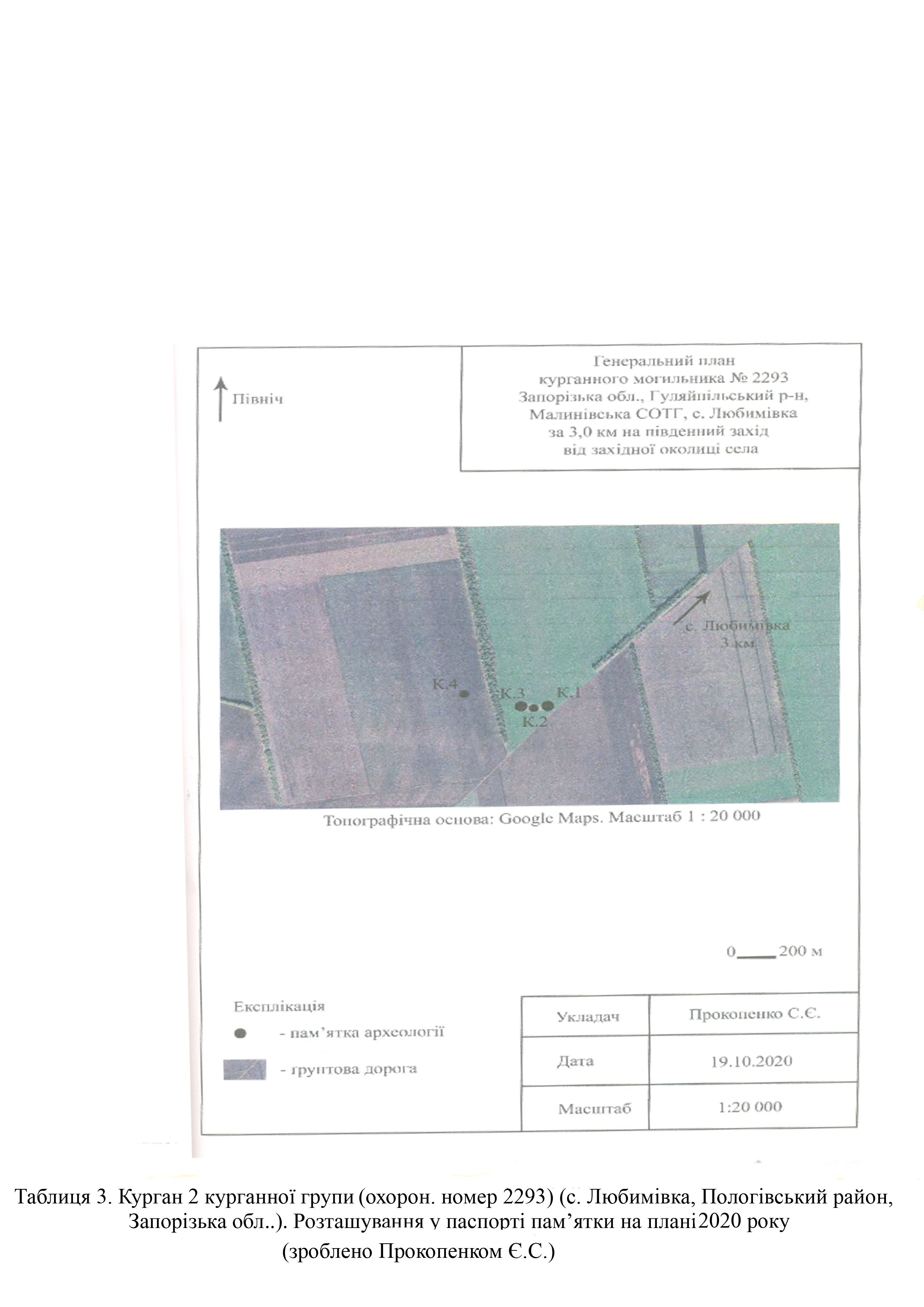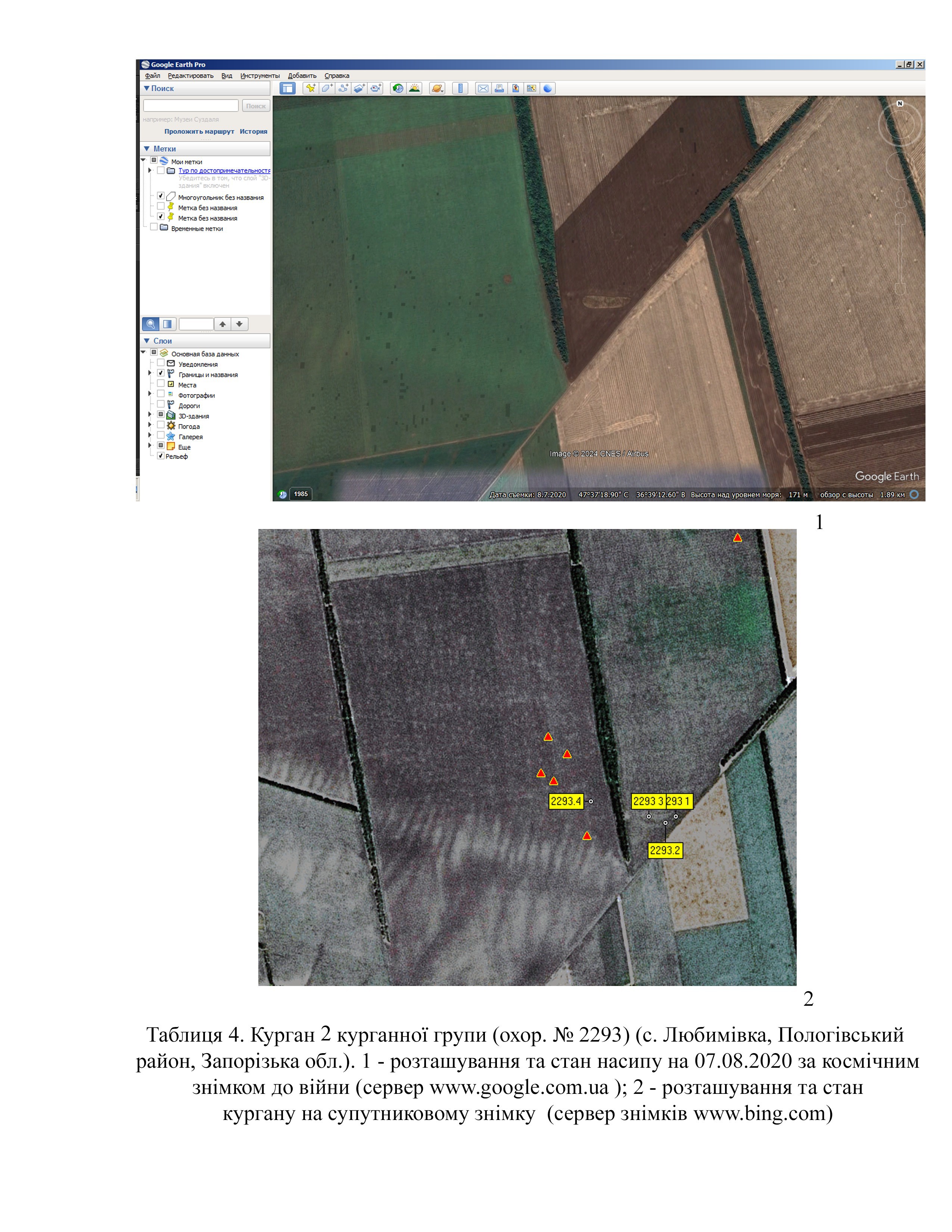 На космічних знімках від 07.08.2020 з серверу Google Планета Земля Pro (https://google-earth-pro. ) добре видно, що курган не має суттєвих пошкоджень (Табл. 4).