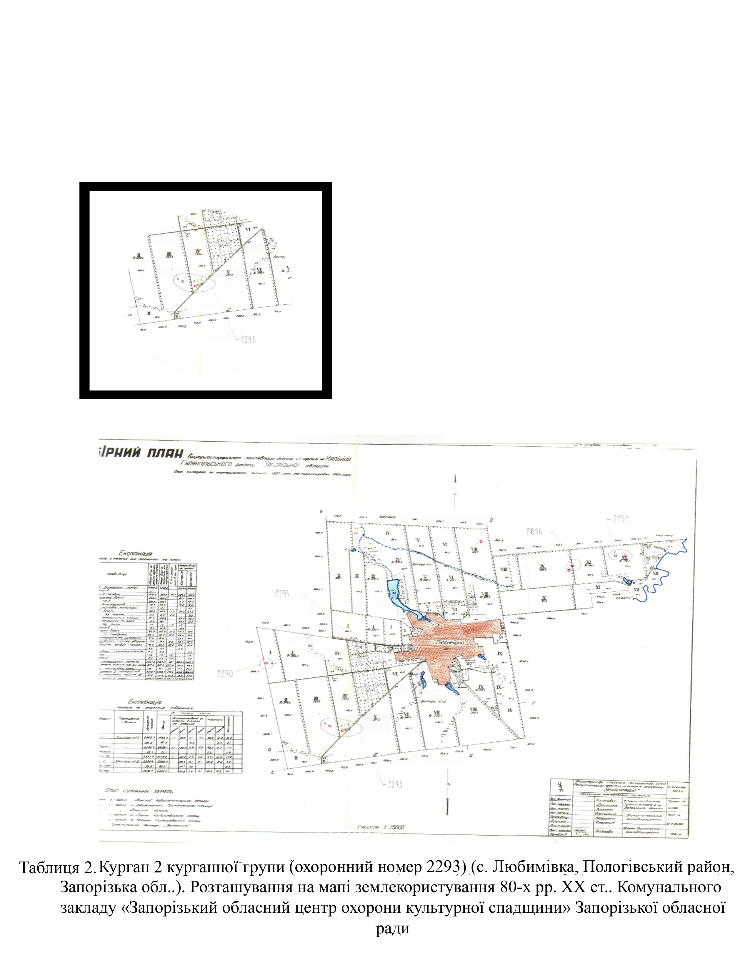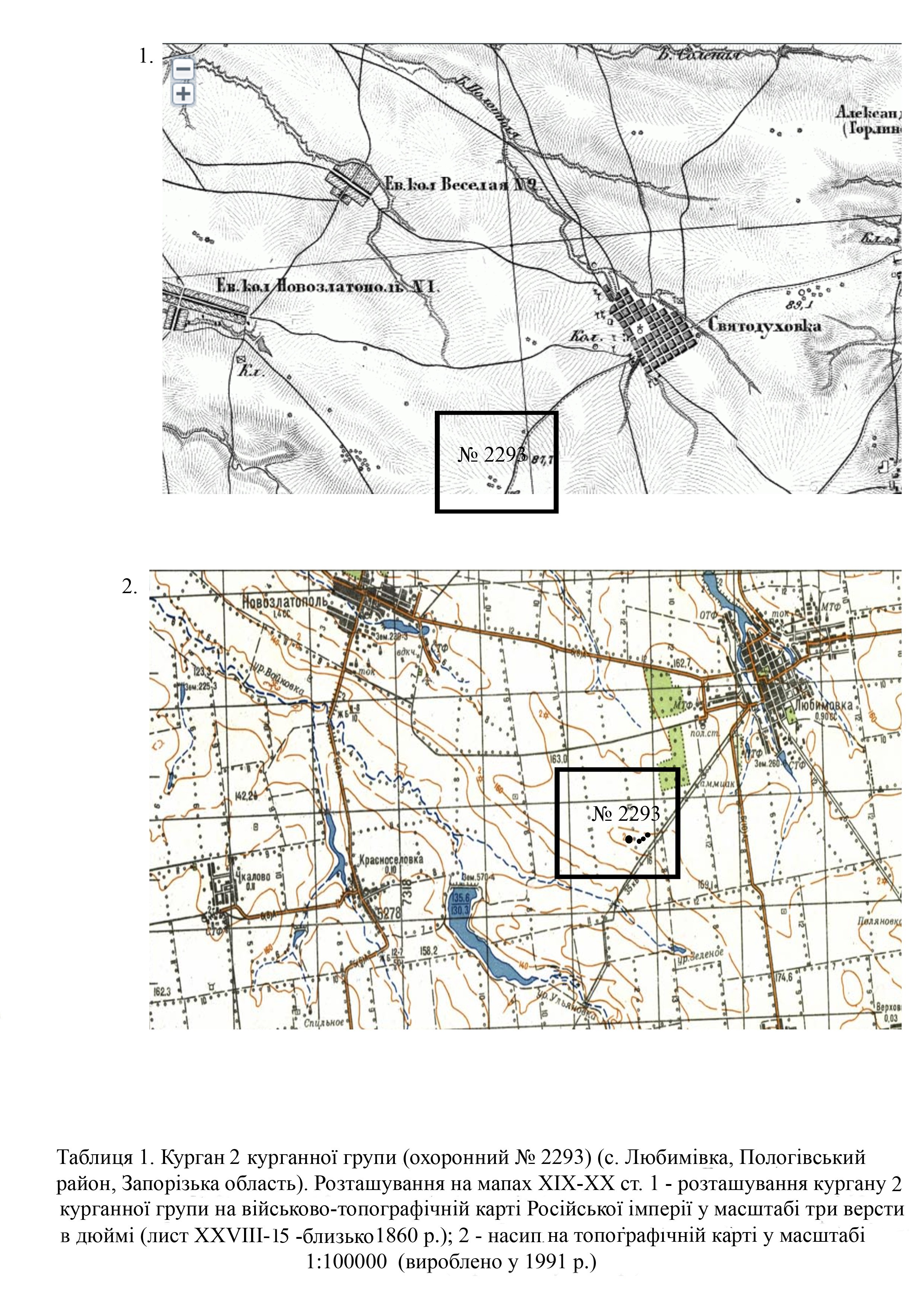 Територія біля Великого Лугу має величезну кількість курганних могильників (Табл. 1). Терміни “курган” або “могила” означають округлий або довгий земляний насип, зведений над одним чи кількома похованнями. Перші кургани почали з’являтися в степовій зоні Північного Причорномор’я в IV тис. до н. е. та проіснували до перш. пол. ІІ тис. н. е. Тривале використання таких насипів як могильників зумовило появу курганних груп. Кургани містять нашарування декількох історичних епох. Поховання, здійснені на різній глибині, розділяють на основні та впускні. Кожного разу курган досипали, на його верхівці встановлювали кам’яні стели, дерев’яні стовпи, неодноразово курган використовували під час тризни – обряду, пов’язаного із вшануванням душ похованих предків.