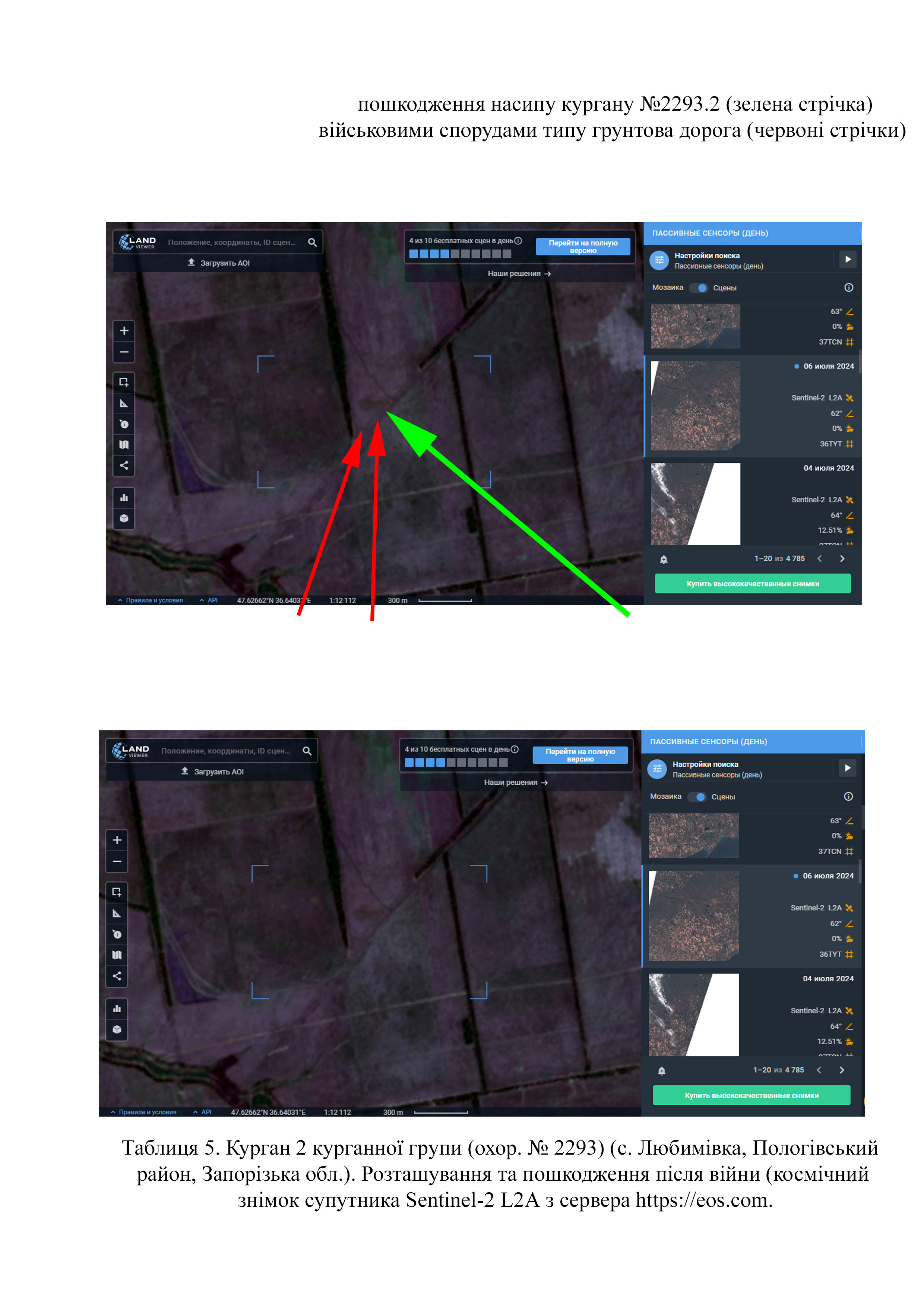 Завдяки знімкам високої якості, можна встановити, що на кургані № 2293.2 зруйновано частину поли через розташування тут ґрунтової дороги (Табл. 5) (космічний знімок супутника Sentinel-2 L2A з сервера https://eos.com на 06.07.2024 р.).